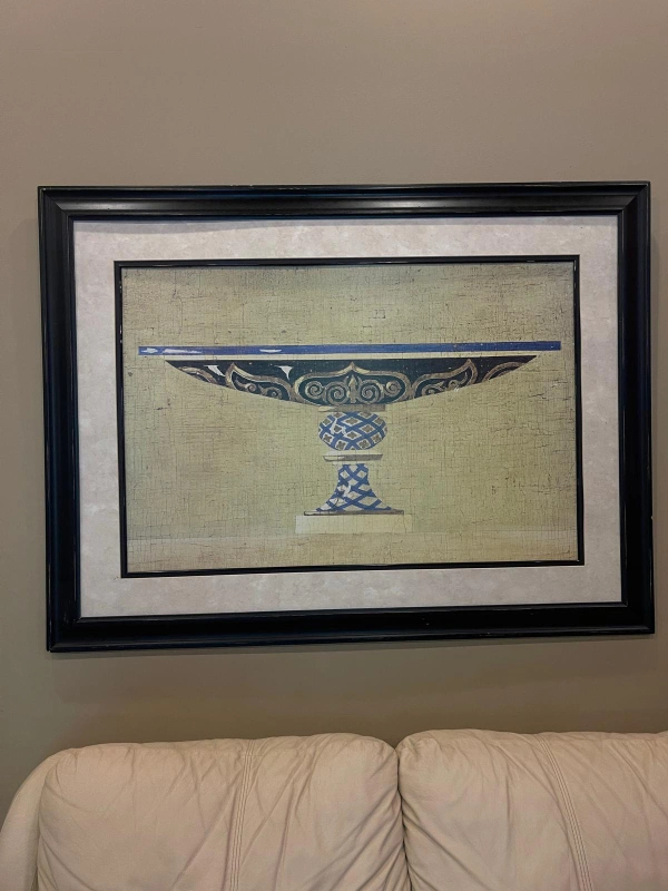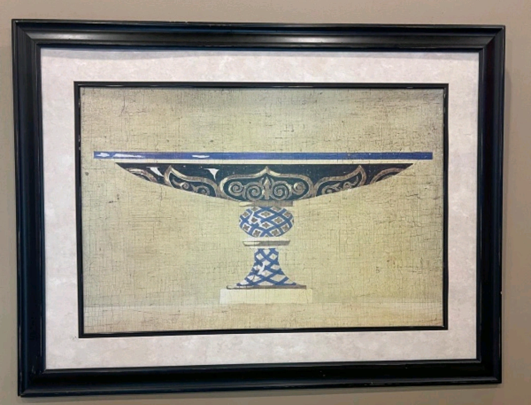 This is a framed art print featuring a decorative bowl design. It's perfect for adding a touch of elegance to any room. The frame is black and in good condition. It's ready to hang and enjoy!