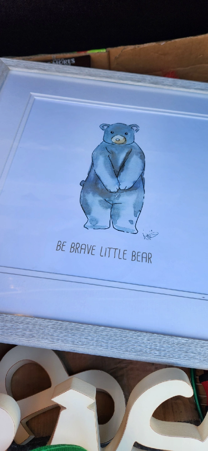 Selling a cute framed print of a blue bear with the words 'Be Brave Little Bear' underneath. Also included is a wooden 'Sweet Dreams' sign in a cursive font. Great for a nursery or kid's room!