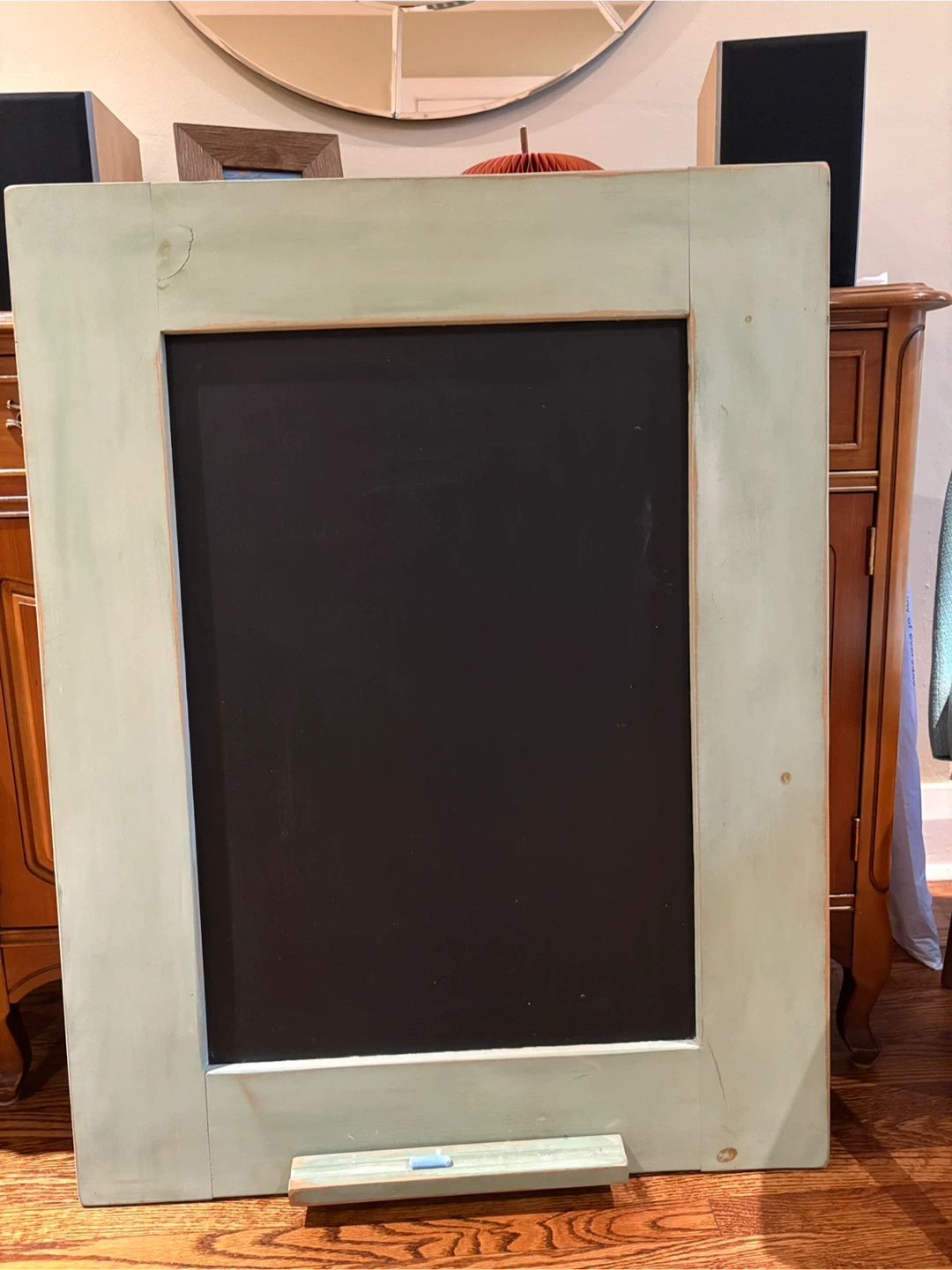 Framed chalkboard, perfect for any room! It comes with a little tray for holding chalk. Beautiful colour and cottage style!