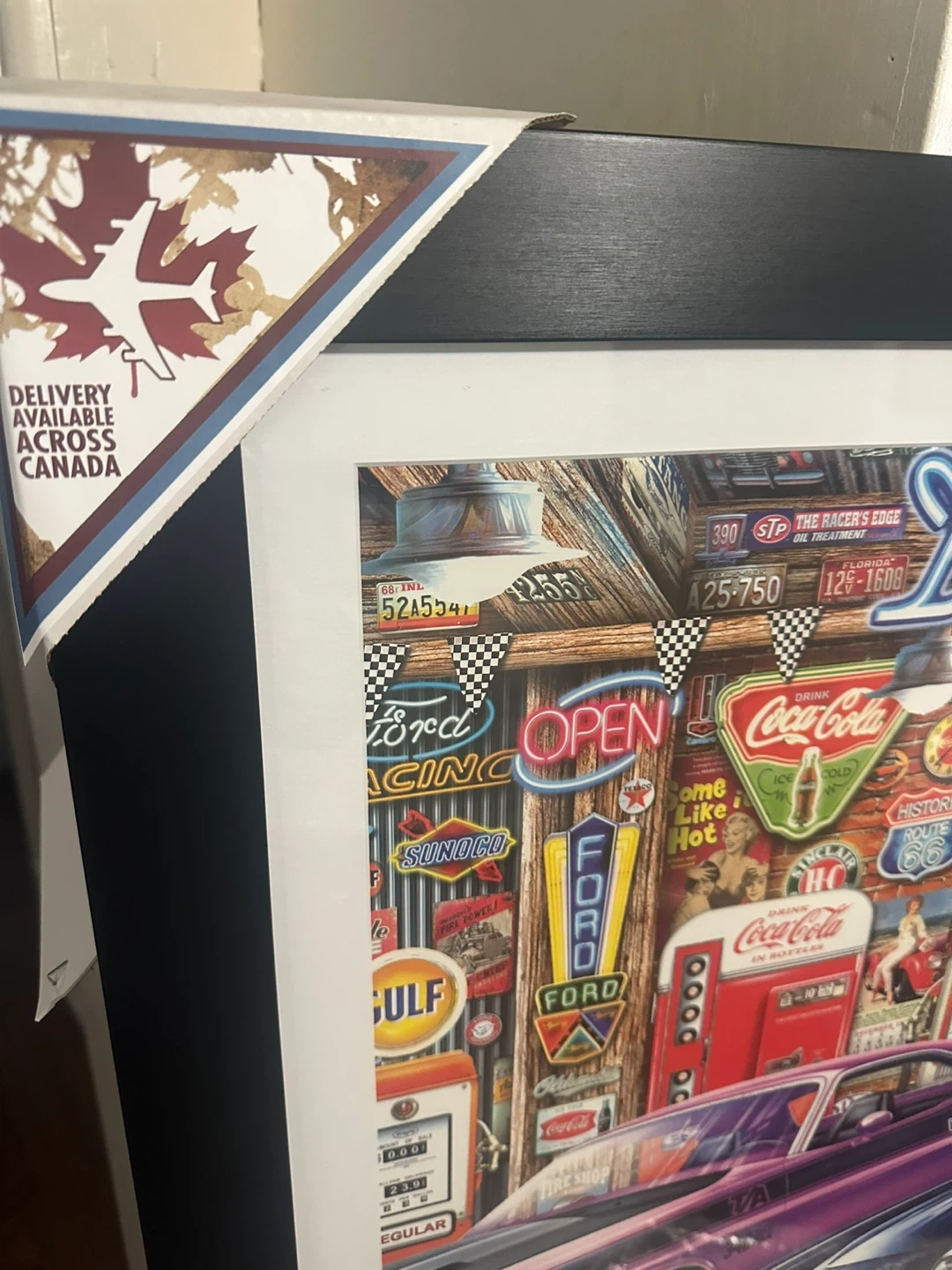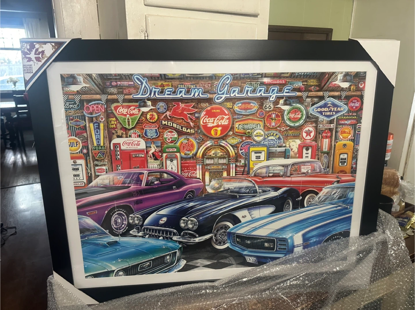 Selling a framed Dean Russo "Dream Garage" print! It's brand new condition and ready to hang. The print features a colourful and detailed image of classic cars and vintage signs, perfect for adding a retro touch to any room. Comes with box , 29.5” h x 38.5” width , paid $180, selling $90.00 . Makes a perfect gift