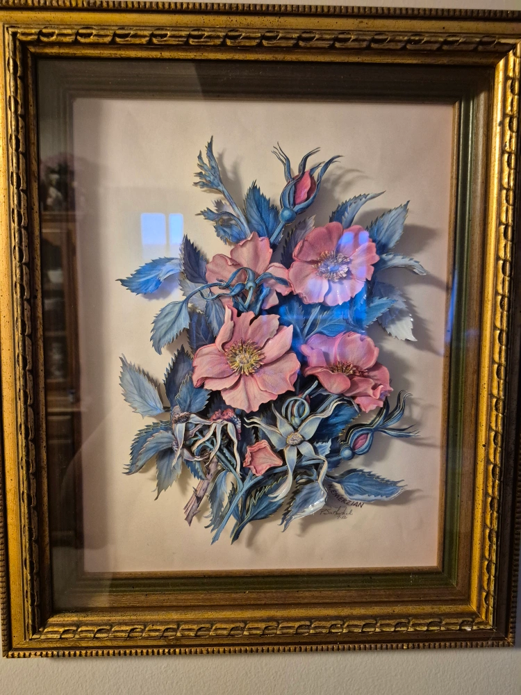 Beautiful framed floral artwork by P. Berberian. This piece features delicate pink flowers and blue leaves in a dimensional design. The frame is a lovely gold colour, adding a touch of elegance to any room