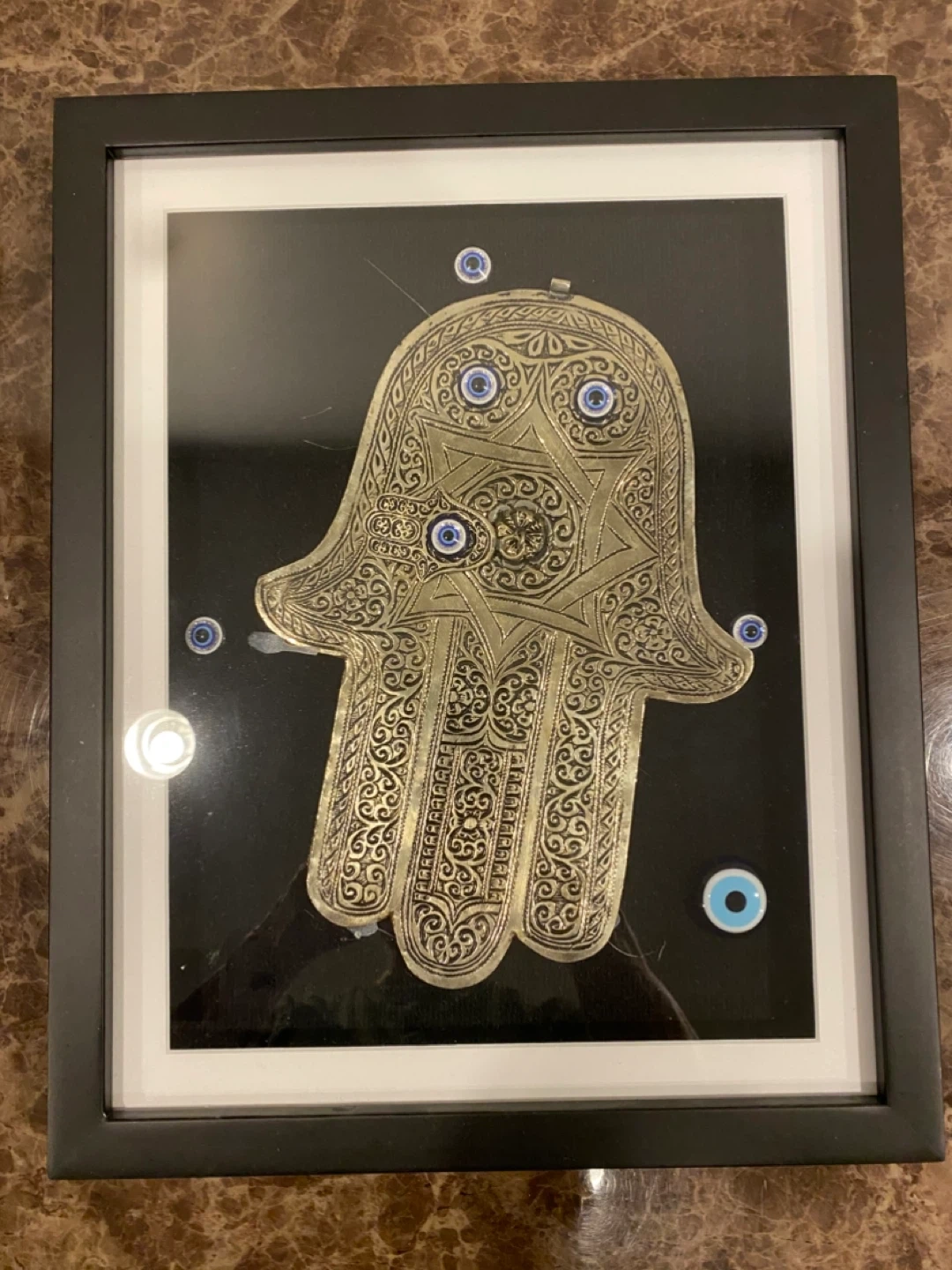 Selling a framed piece featuring a Hamsa hand design with embedded evil eye amulets. The frame is black and the Hamsa hand is a metallic gold colour. It's a unique piece of decor!