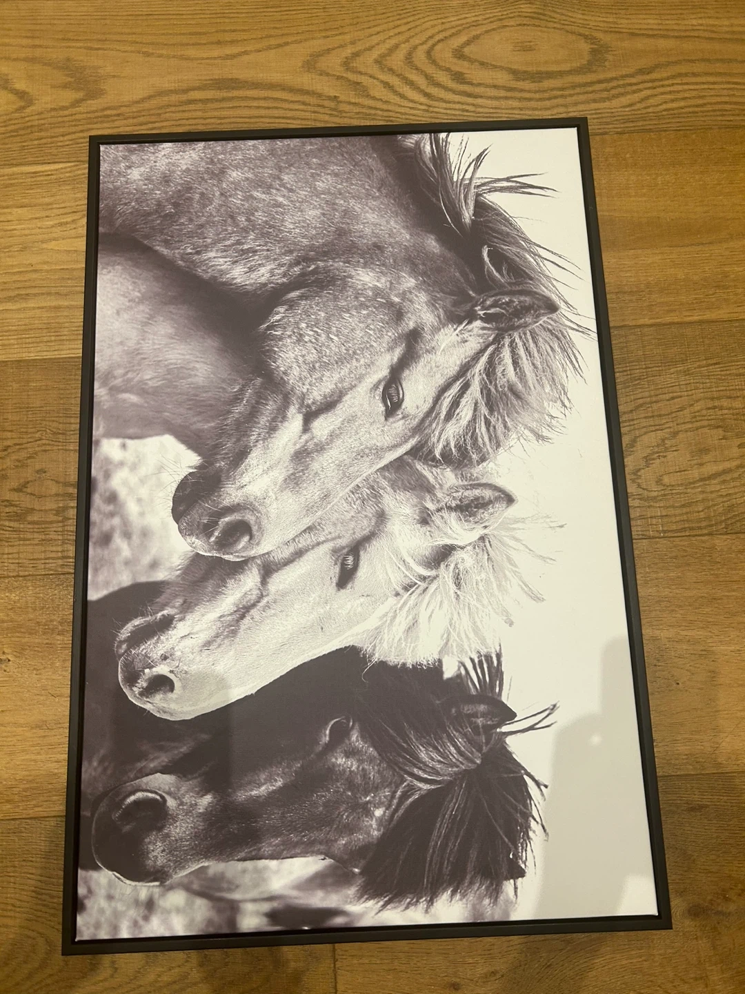 Selling a framed print featuring a black and white image of three horses. It's in great condition and ready to hang in your home. The frame is a simple black design that complements the artwork nicely.