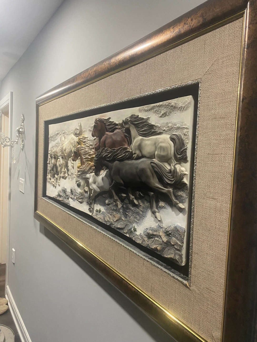 Framed 3D wall decor with a horse theme. The horses are sculpted in relief and appear to be running. The frame has a burlap fabric lining.