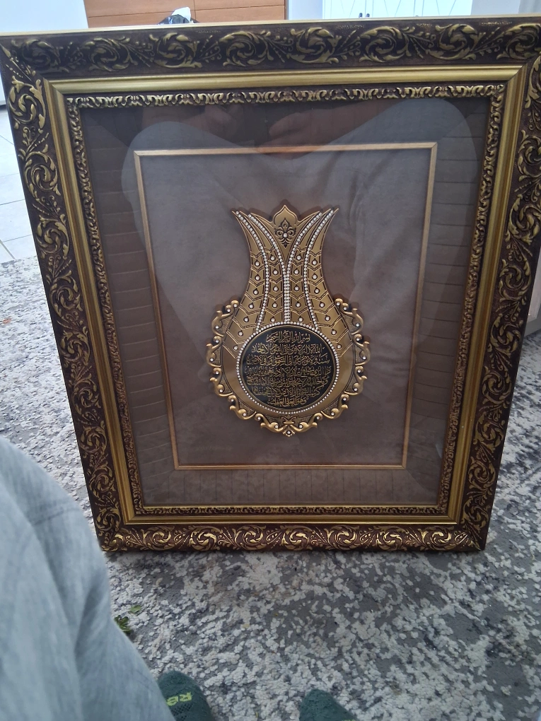 Beautiful framed Islamic art piece with intricate gold detailing. It would be a lovely addition to any home!