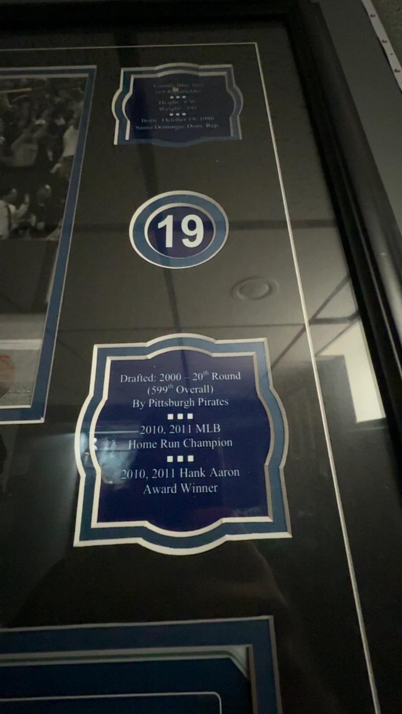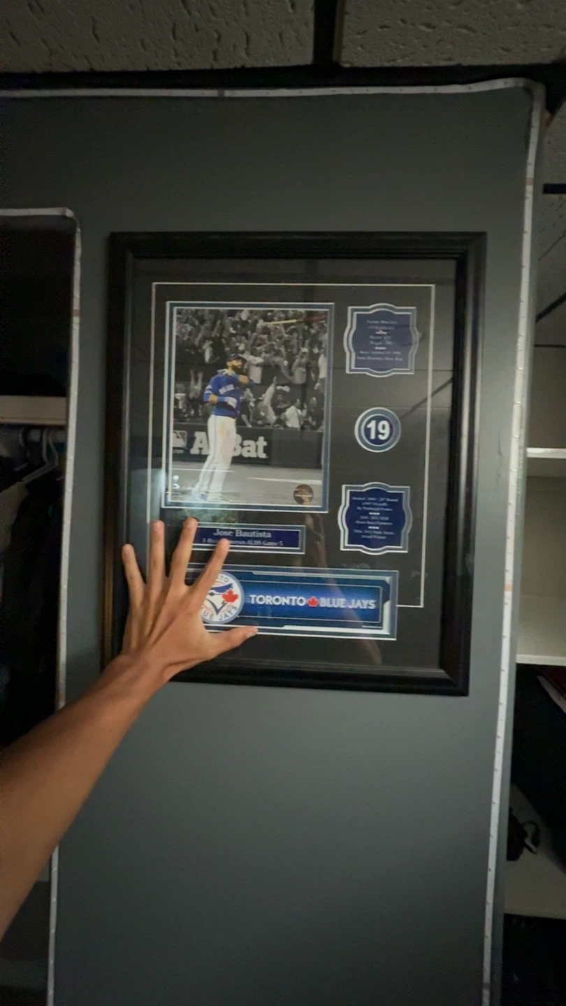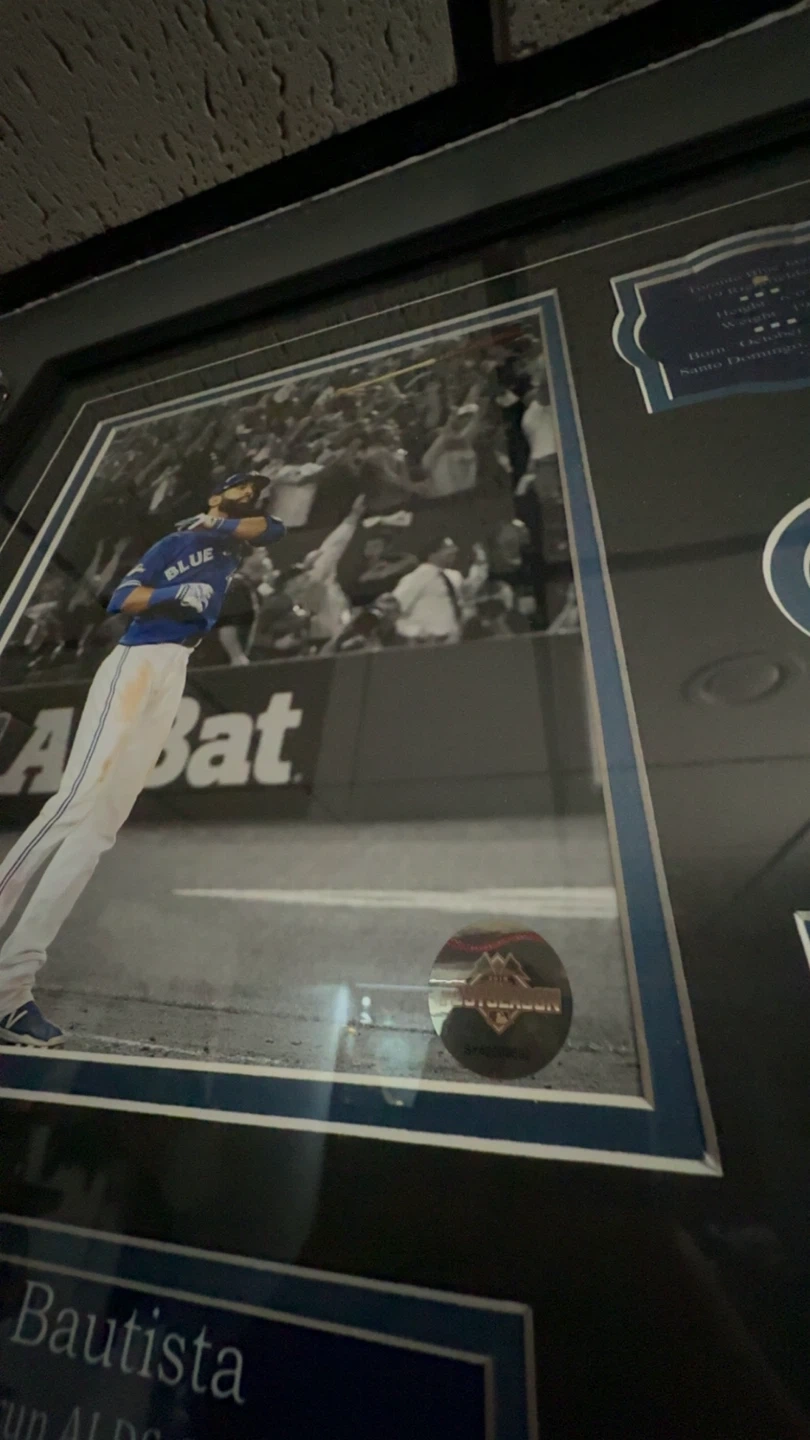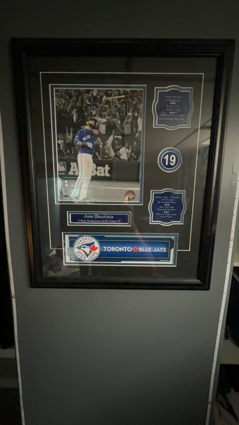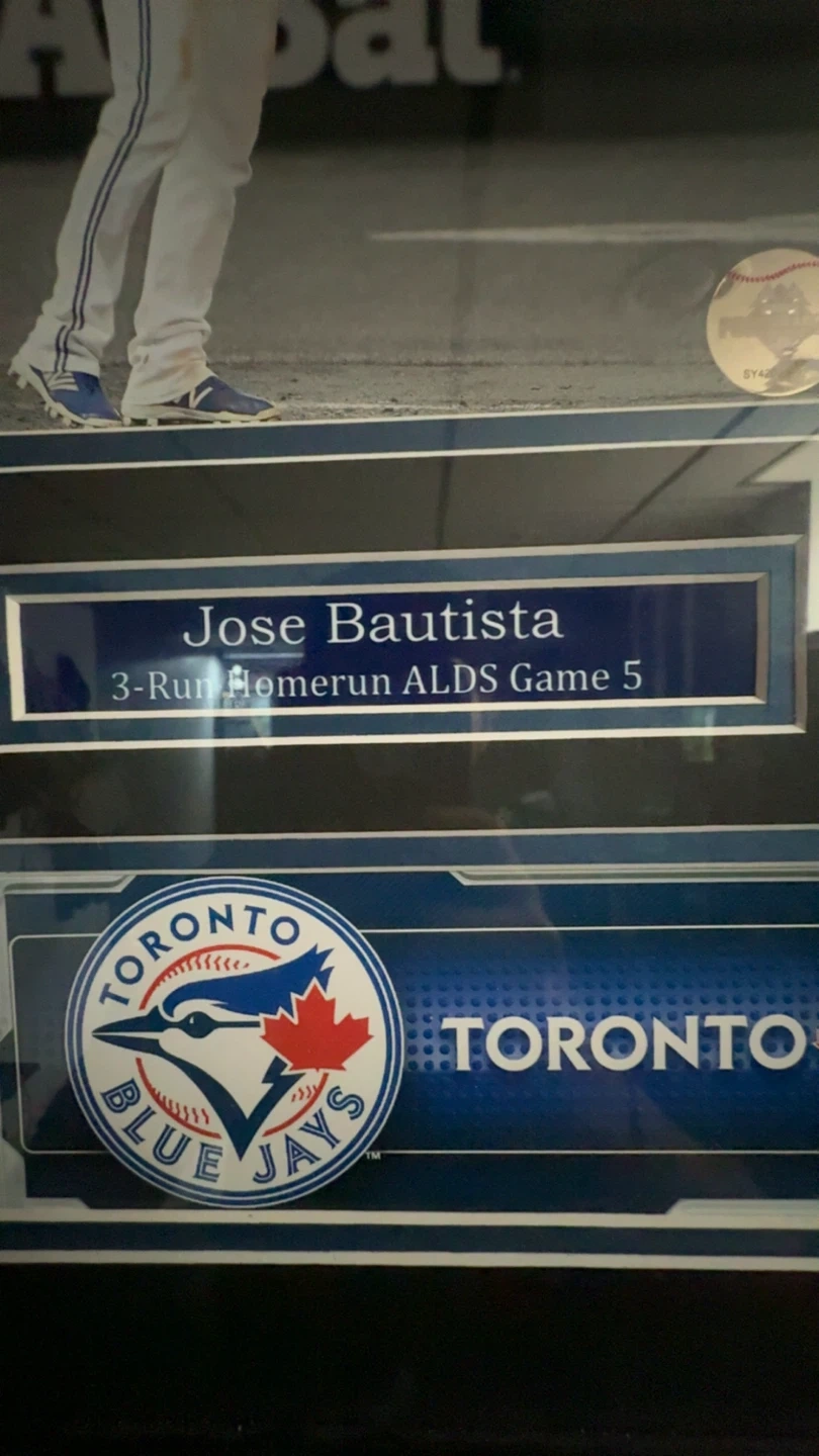 Selling a framed piece of memorabilia featuring Jose Bautista of the Toronto Blue Jays. It commemorates his 3-Run Homerun ALDS Game 5. A great piece for any Blue Jays fan!
