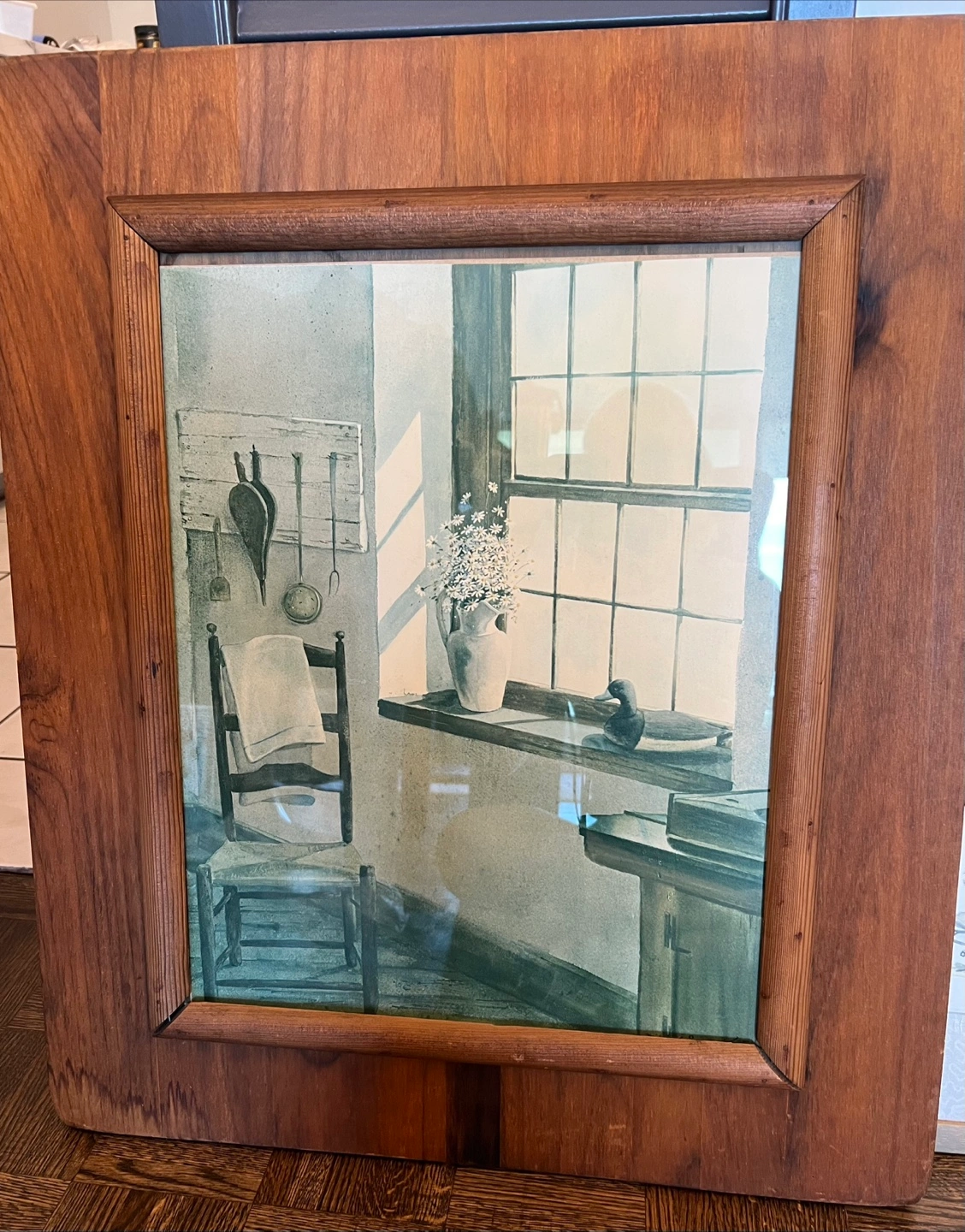 A lovely framed print featuring a charming kitchen scene! The frame is made of wood and adds a warm, rustic touch to the artwork. It's ready to hang and would look great in any room of your house Rustic appearance. Pick up Yonge & St Clair Cash required