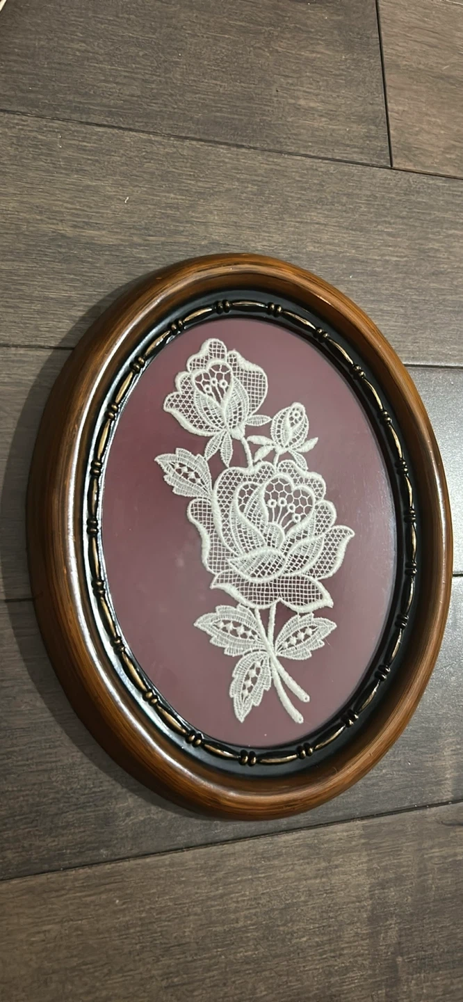 Selling a charming framed piece of lace art featuring a delicate rose design. The frame is wood with a brown finish and a black and gold inner trim. It's in great shape and ready to add a touch of vintage elegance to your home decor