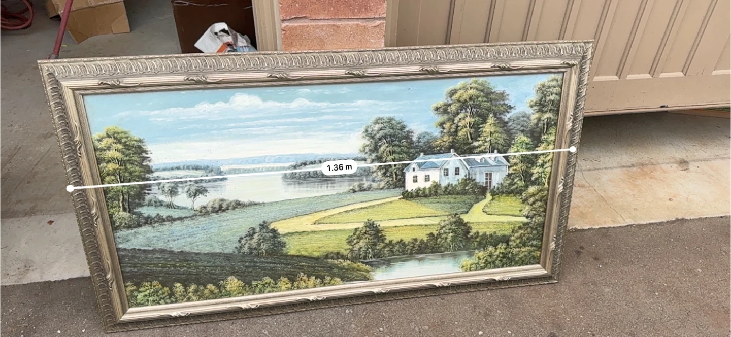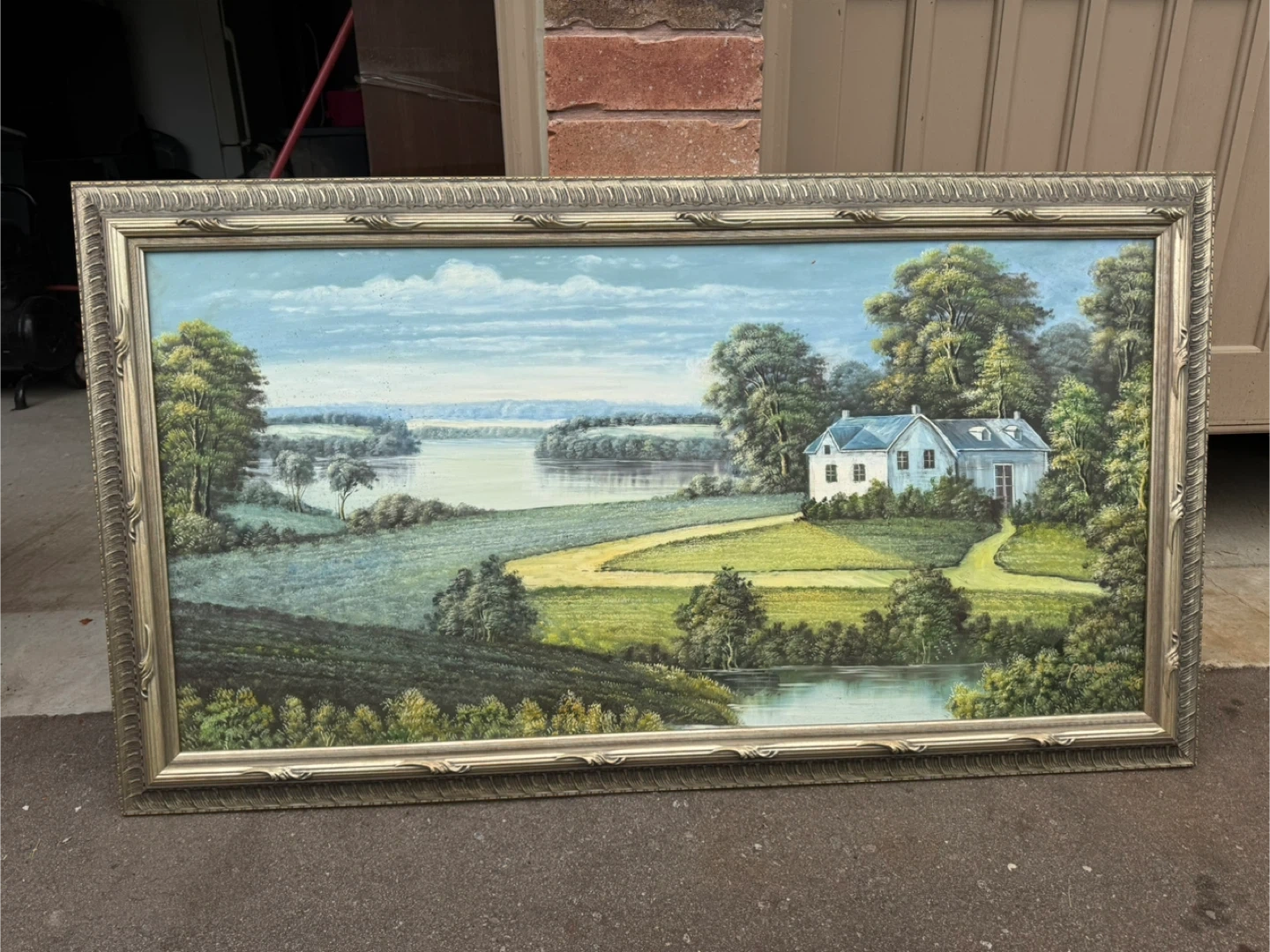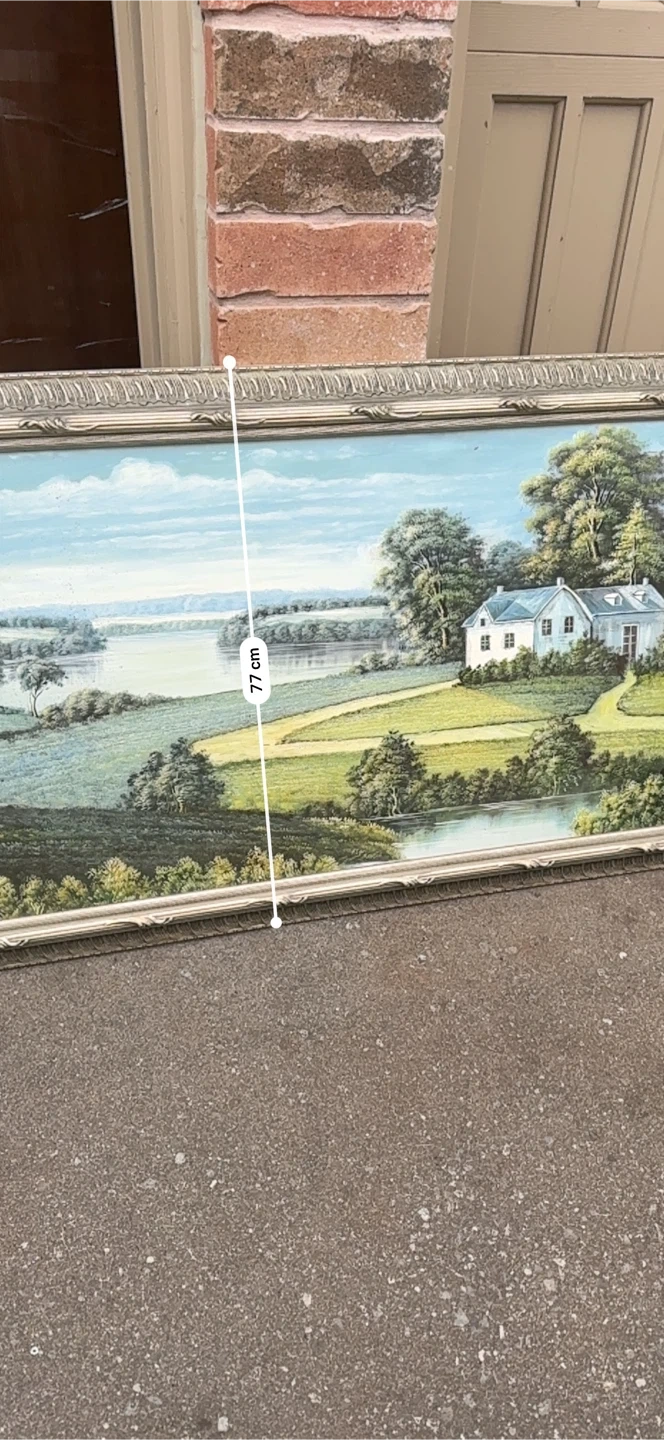 Selling a framed landscape painting in good condition.The frame is ornate and adds to the overall aesthetic. Dimensions are 1.36 meters in width and 77 cm in height
