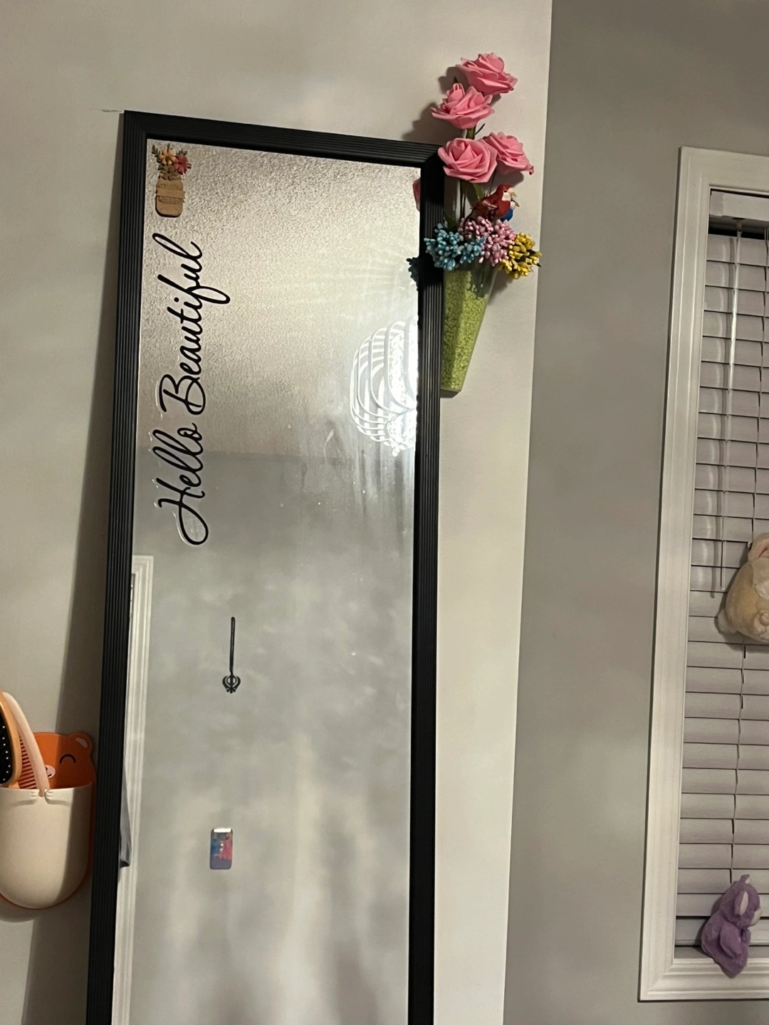 A framed mirror with the words "Hello Beautiful" on it. Perfect for any room!