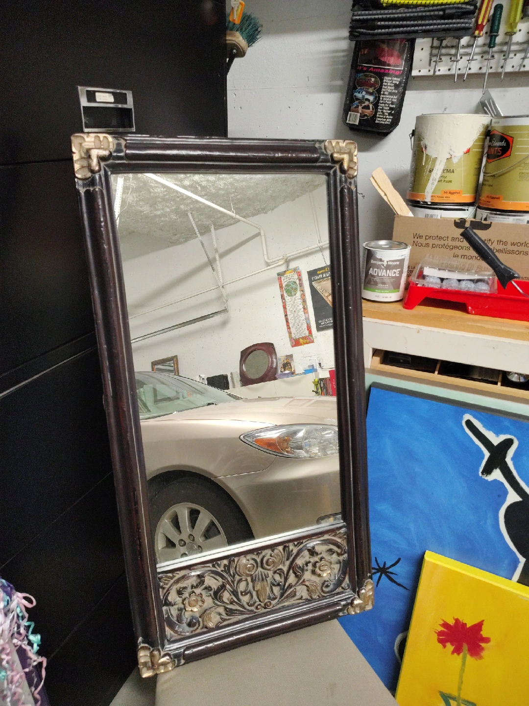 This is a framed mirror with a dark brown frame and ornate gold-coloured detailing on the corners and bottom. It would add a touch of elegance to any room!