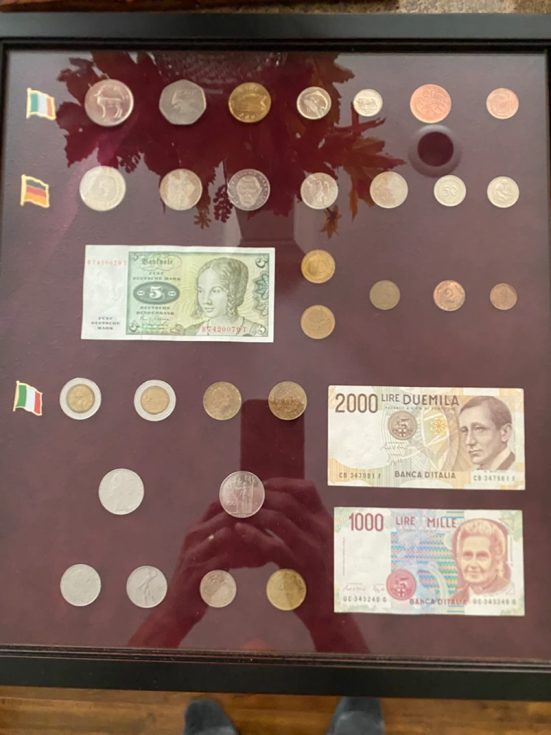 I'm selling a framed collection of foreign currency. It includes coins and banknotes from the country's of Germany Ireland and Italy. A unique piece for collectors or anyone interested in international currency! I priced the Italian currency alone at $200 A very fine display item in a nice frame and some of the older coins look to be silver.