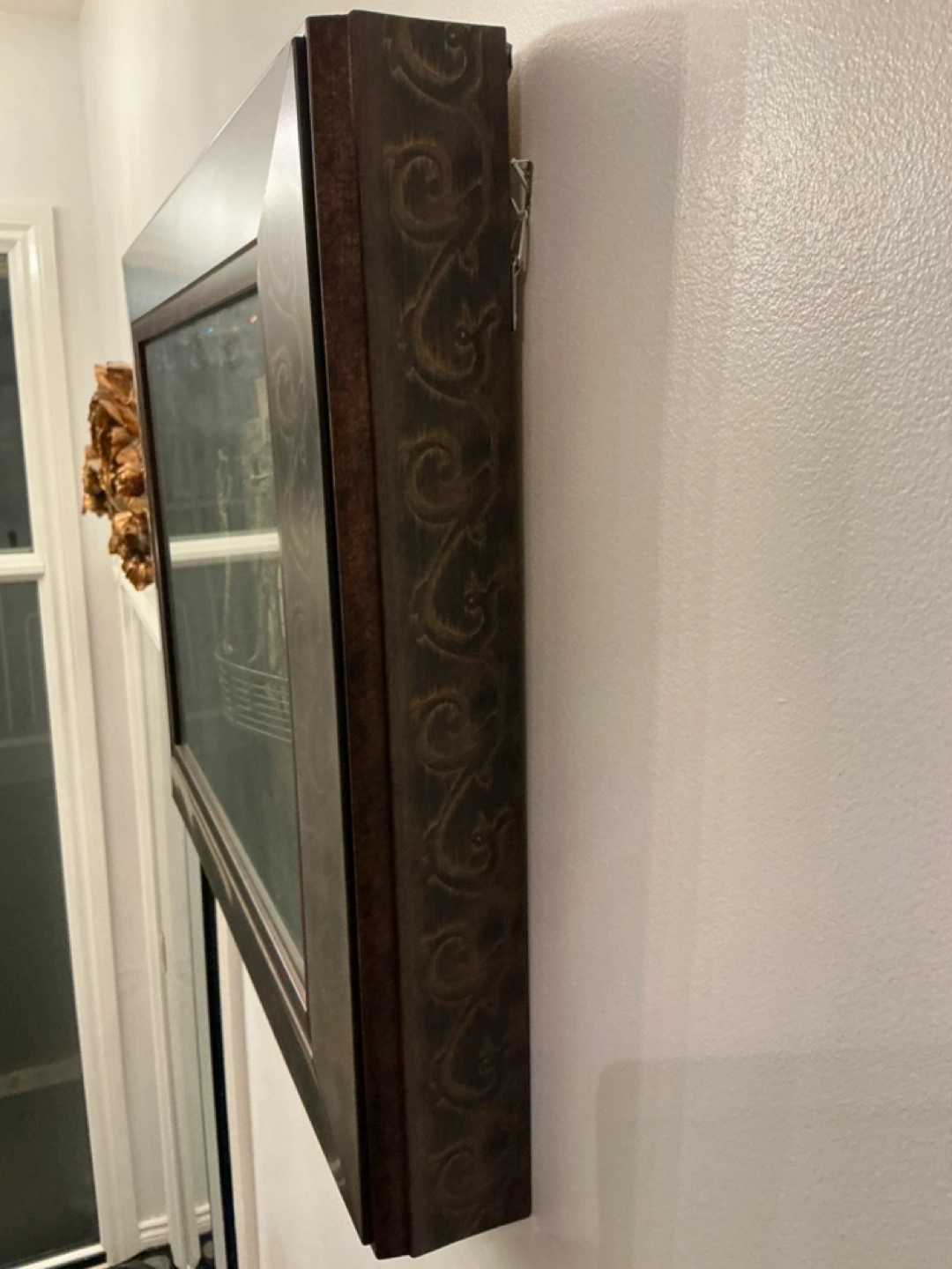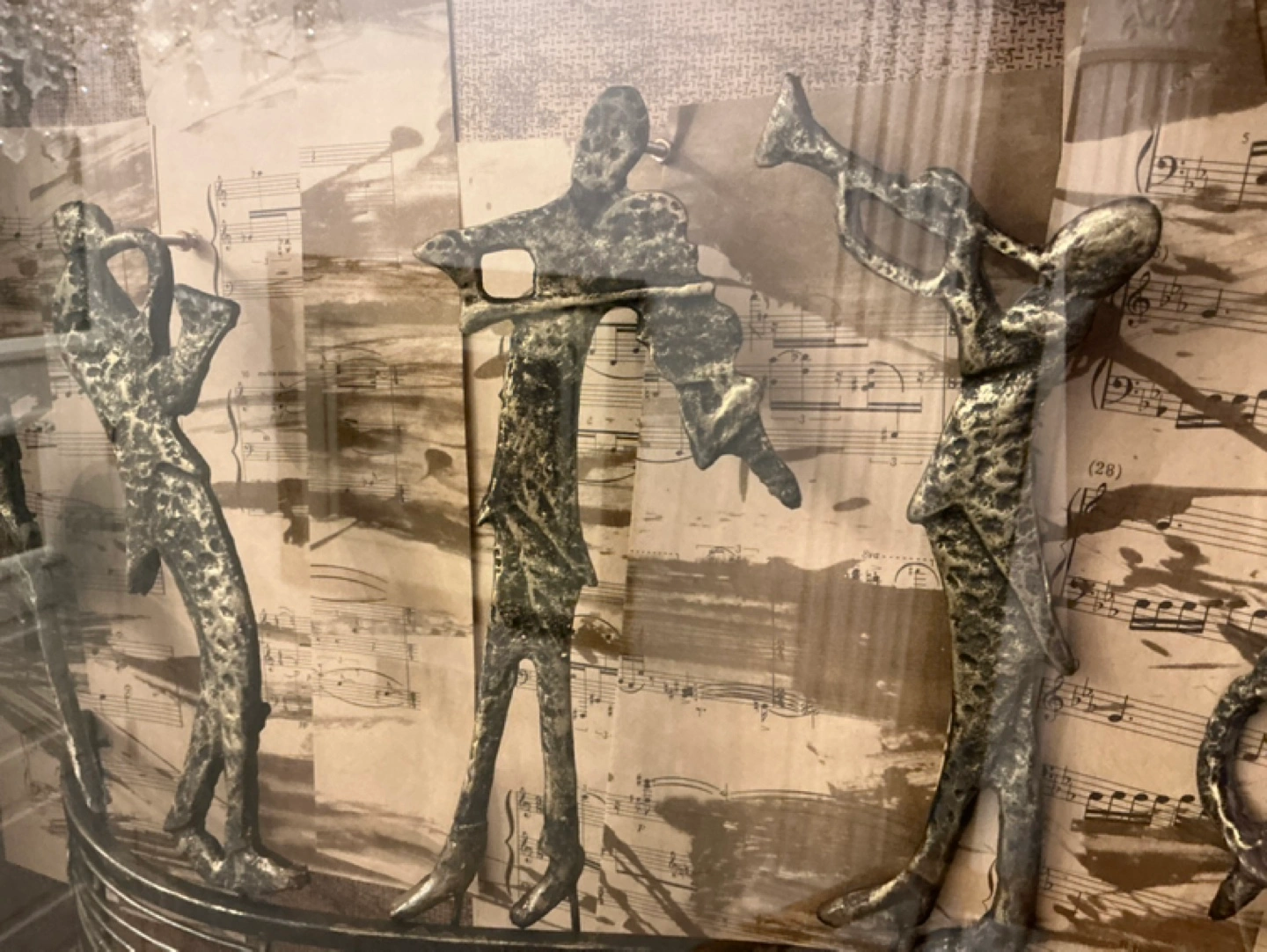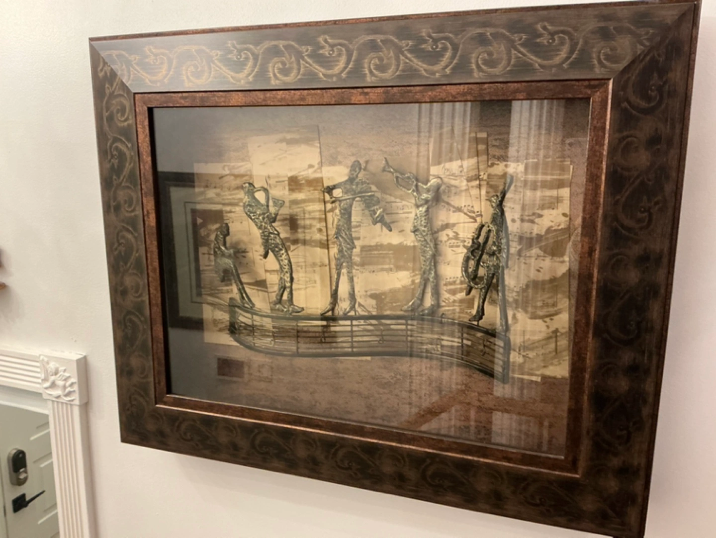 Unique shadow box framed wall art. Features a band of musicians sculpted in pewter against a backdrop of musical notes. Dark brown frame with decorative detailing. Perfect for adding a touch of musical flair to your home décor.