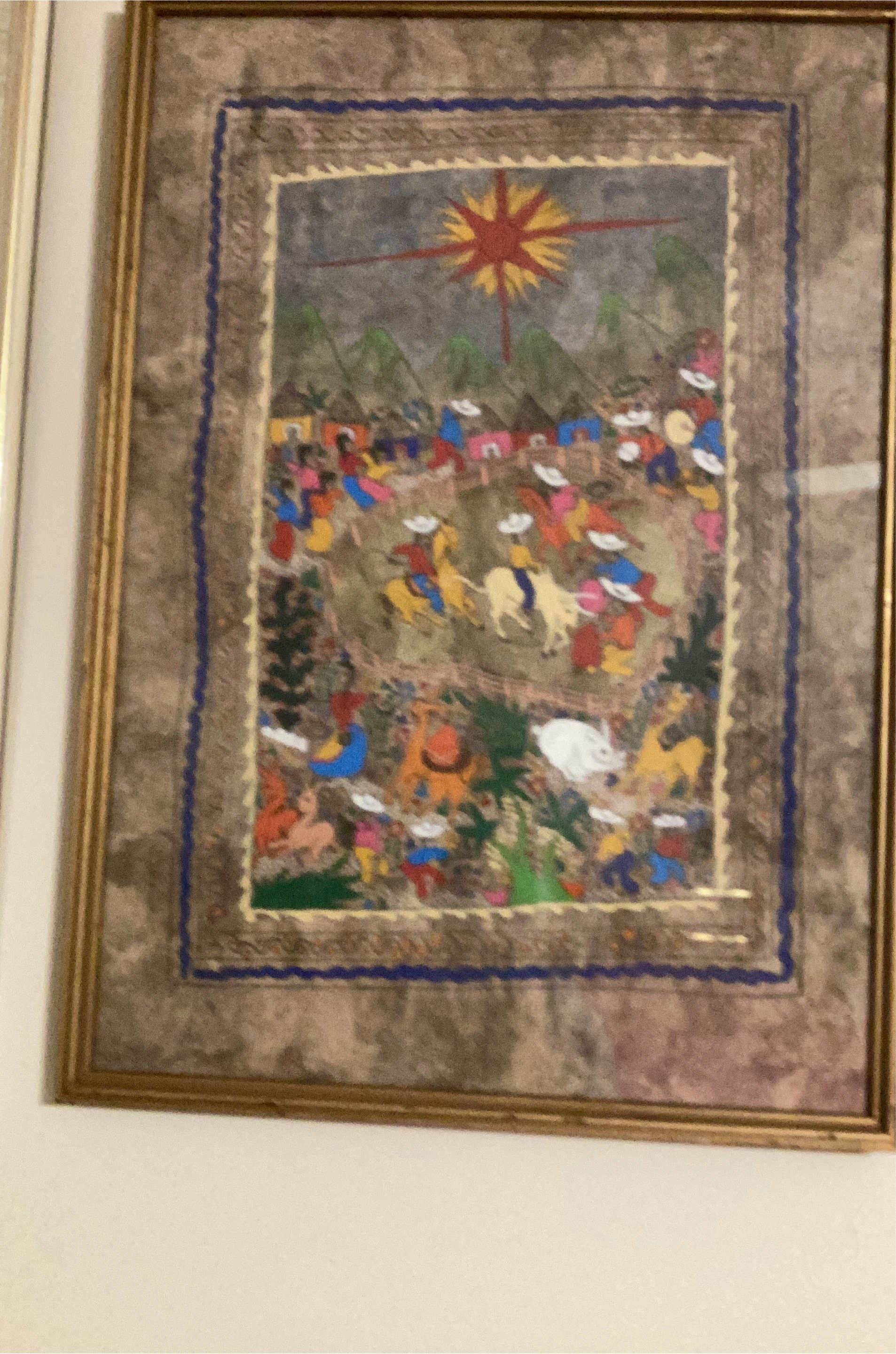 This is a framed painting. It has a gold frame and a painting of a scene with people and animals.