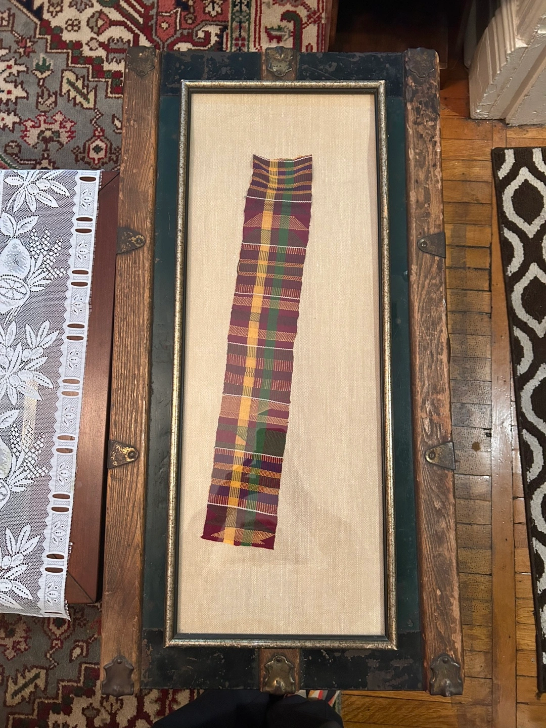 Unique framed textile art featuring a colourful plaid design. The frame has a vintage look with a dark finish and some wear, adding to its character. Perfect for adding a touch of texture and pattern to your home decor
