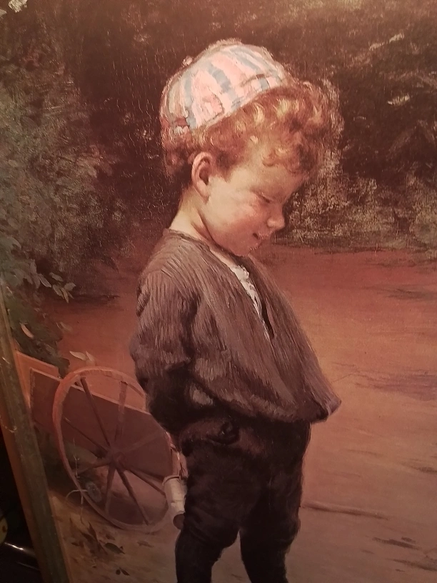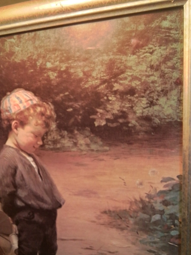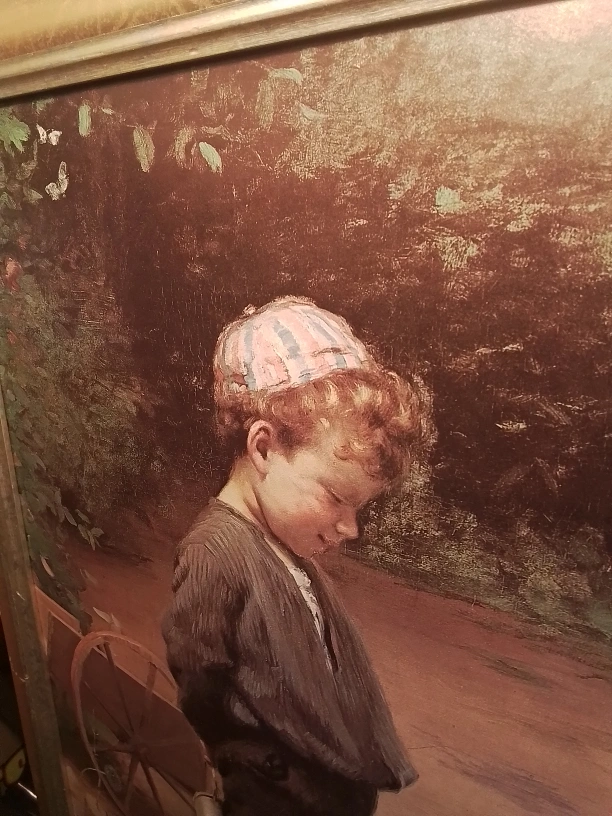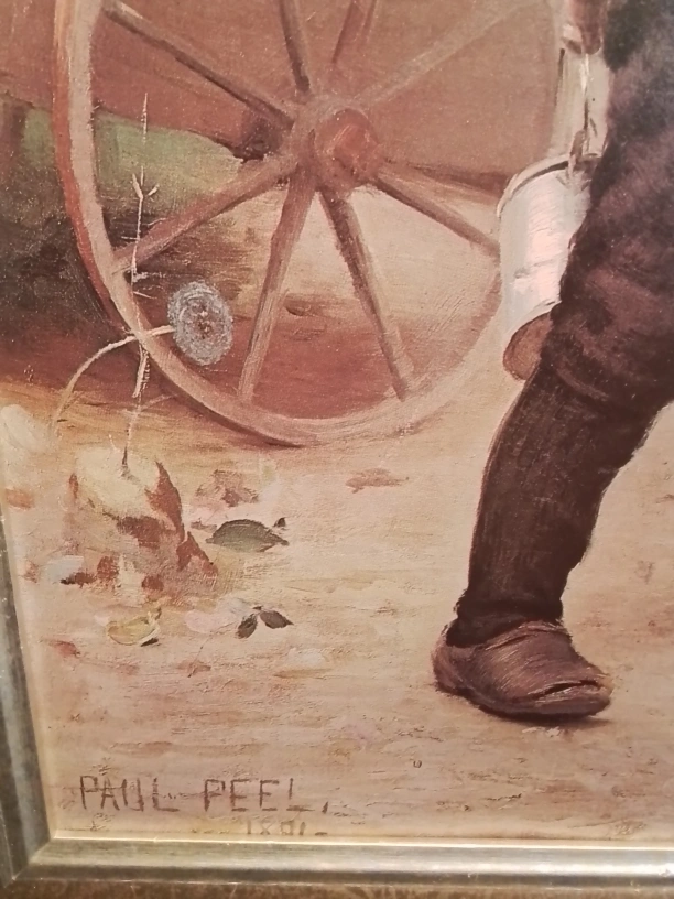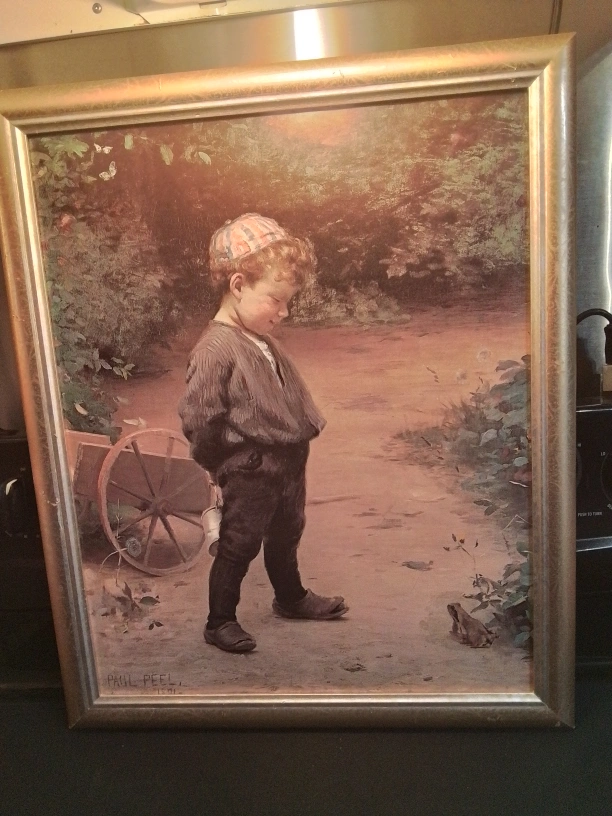 Framed Poul Peel 1801 print This framed Poul Peel 1801 print, showcasing a young boy and a frog, is a beautiful piece of art. The print is in good condition considering its age. The frame complements the artwork, making it a great addition to any collection. A little piece of history to brighten your day. Who knows what stories this print could tell if it could talk! Measurements 18.5 x 22.5" Pickup at Yonge Street and Steeles Avenue This is a framed painting by Paul Peel. It features a young boy looking at a frog. The frame is gold coloured.