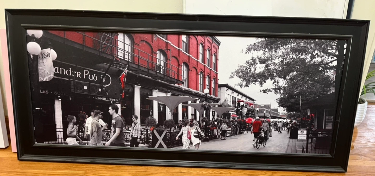 Framed print featuring a black and white image with a pop of red from the Alexander Pub. It's a nice piece to add some character to your space 53’x23’ Pick up near Bayview and Elgin mills