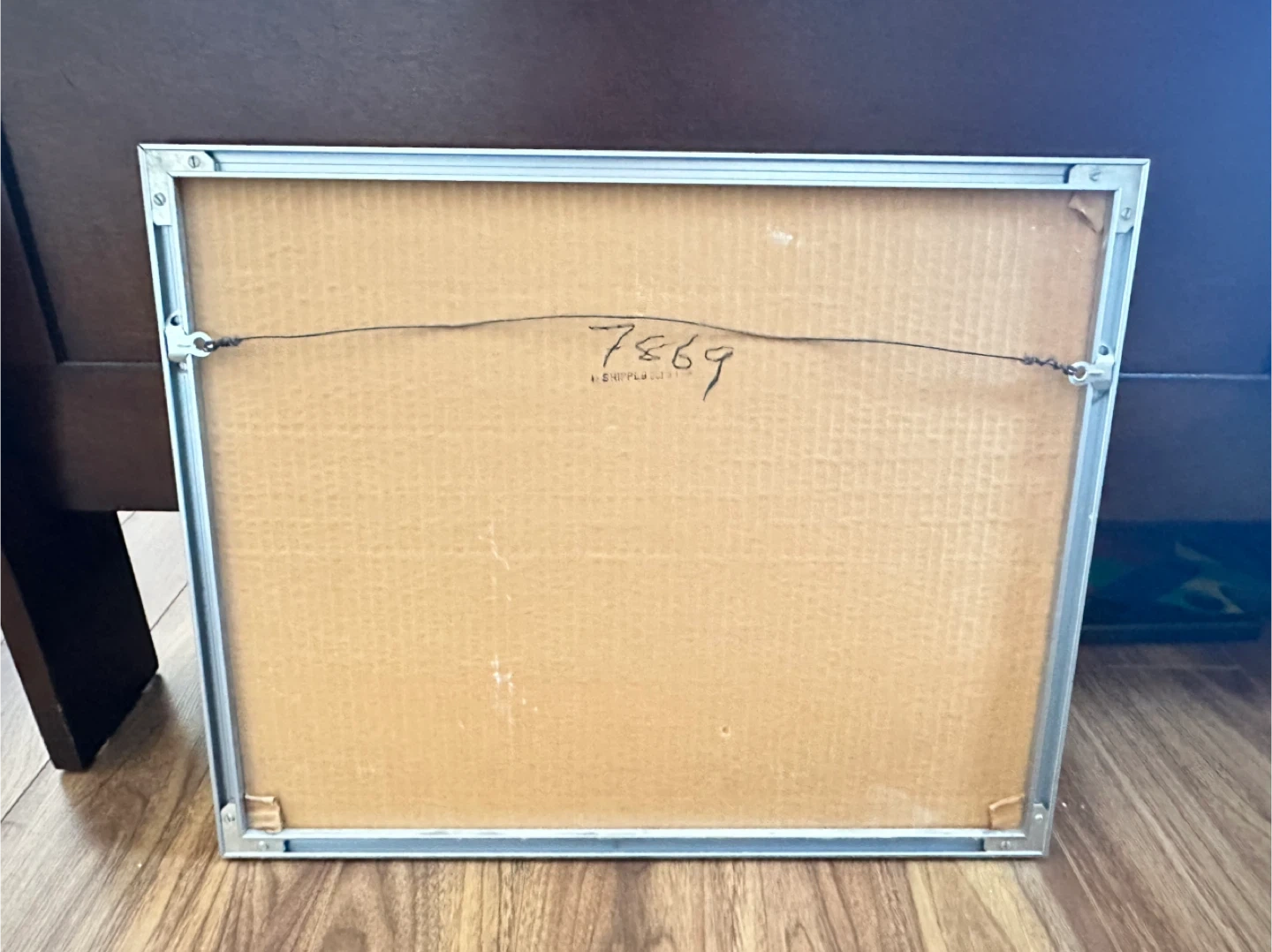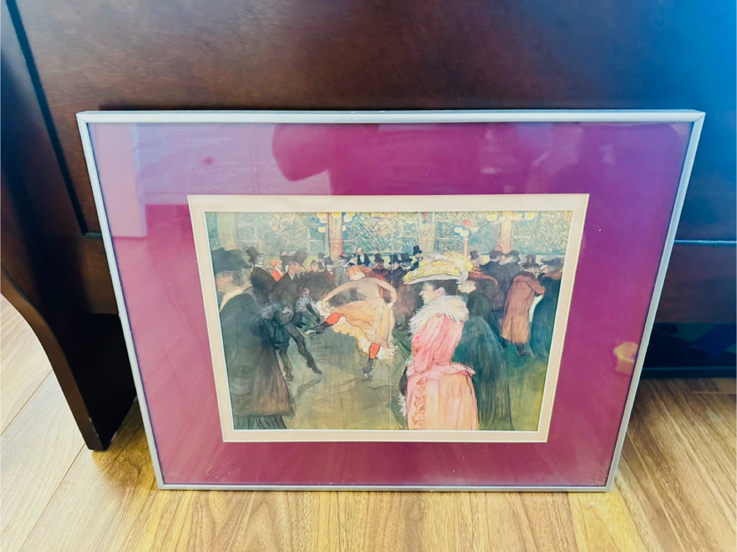 Framed print of a scene from Moulin Rouge. The frame is silver and the print has a burgundy matte border. It's in great condition and ready to hang in your home! Size:20-1/4x16-1/4