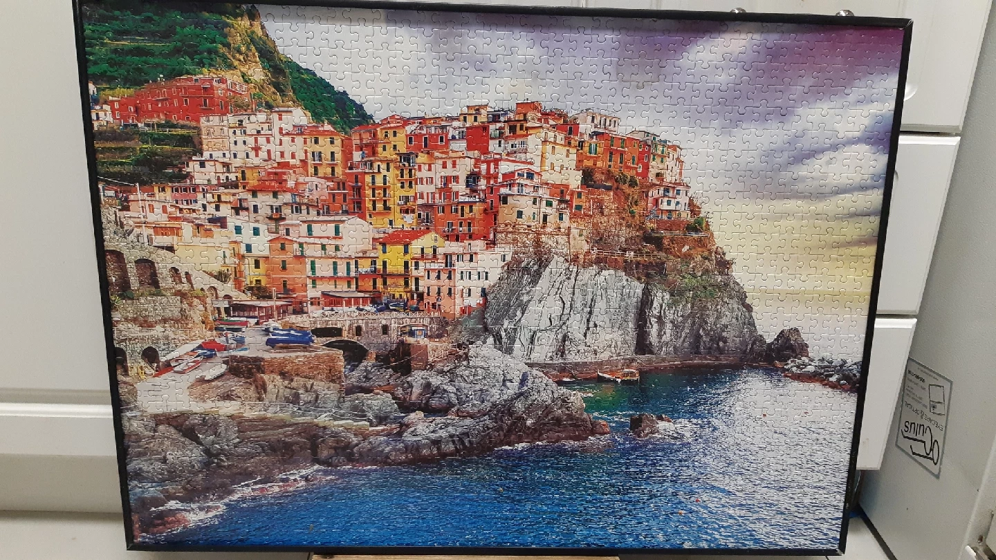 Framed puzzle depicting Cinque Terre, Italy. It's a beautiful scene of the colourful buildings and coastline. Ready to hang and enjoy! pickup location is near Jane st and Rutherford rd Vaughan