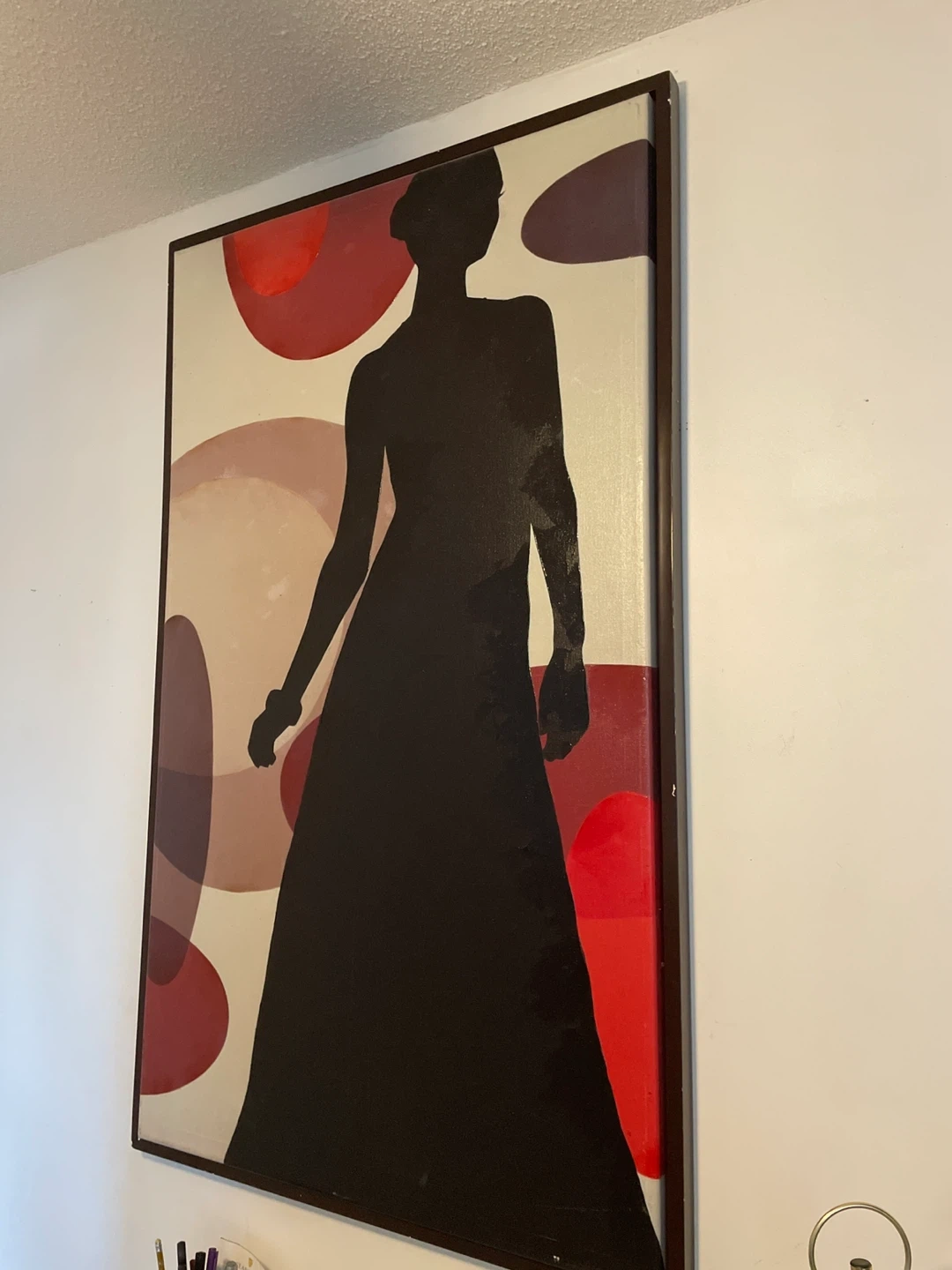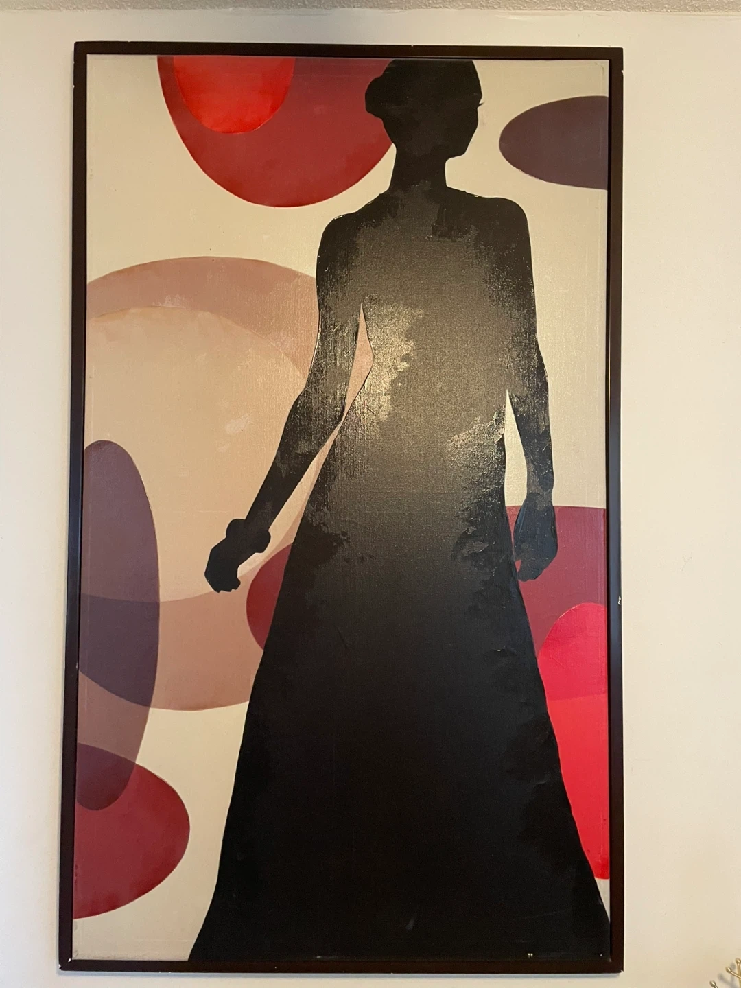 Selling a large framed silhouette art piece. It features a silhouette of a woman in a long dress against a background of red and beige circles. It's a striking piece that would add a touch of elegance to any room 51”x31”