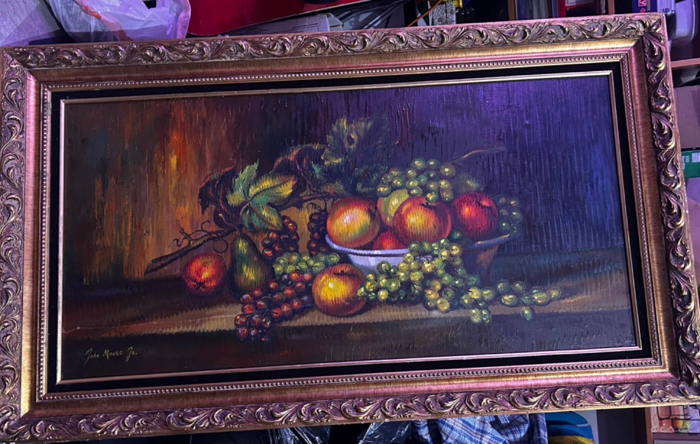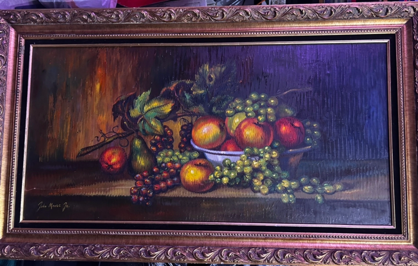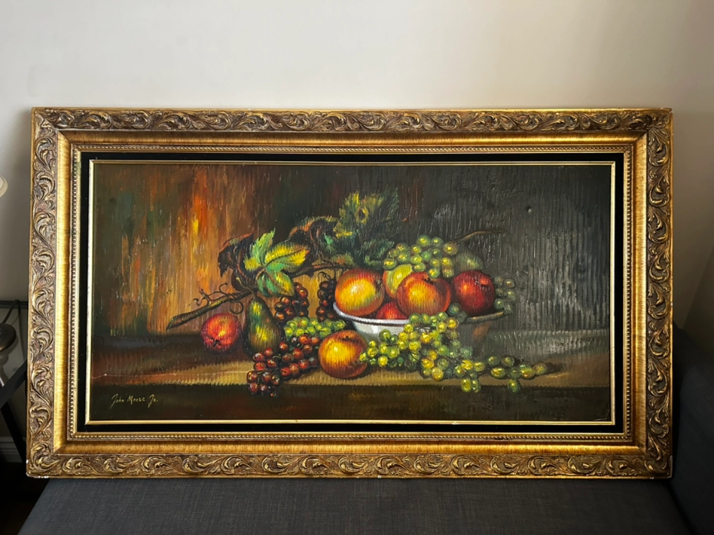 Oil on canvas still life painting. Features a bowl of fruit, including apples, pears, and grapes. Ornate gold frame. Signed by the artist-John Moore Jr.