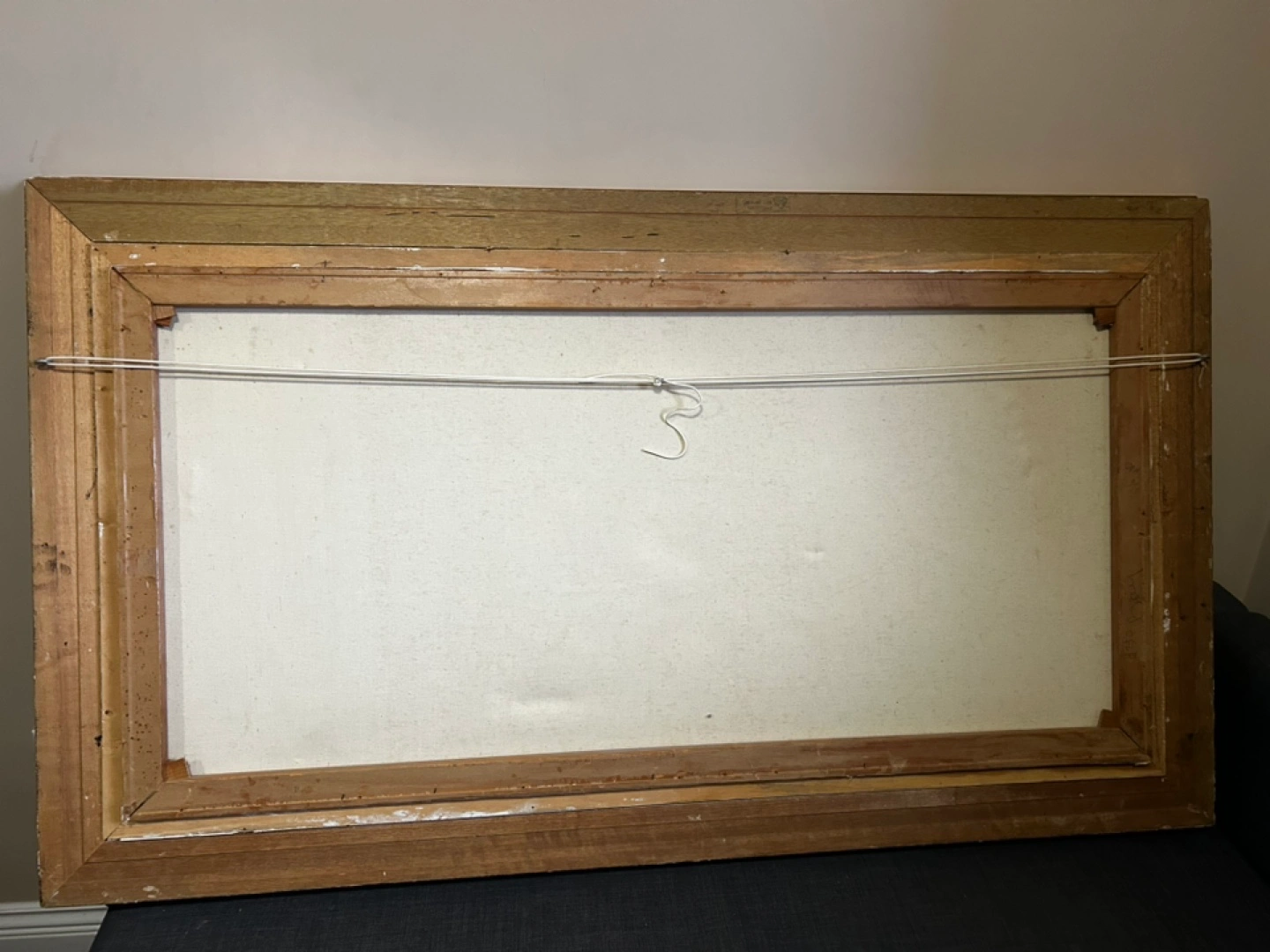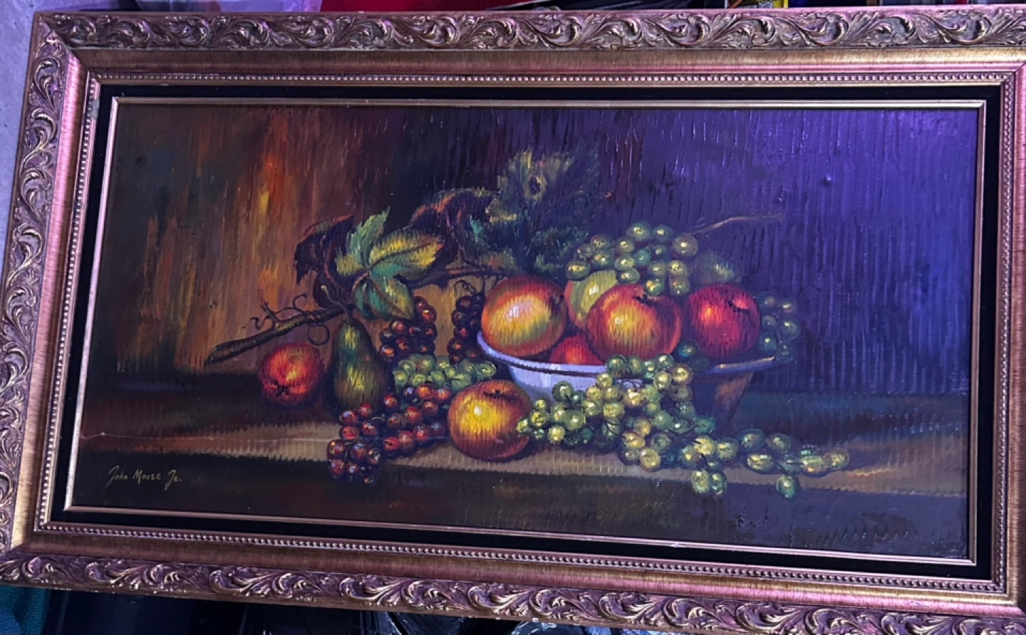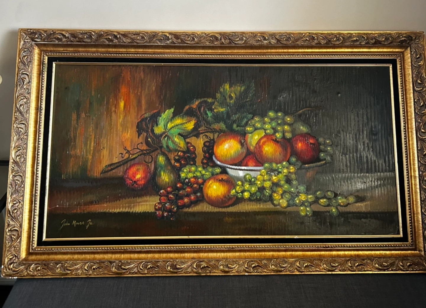 Oil on canvas still life painting. Features a bowl of fruit, including apples, pears, and grapes. Ornate gold frame. Signed by the artist-John Moore Jr.