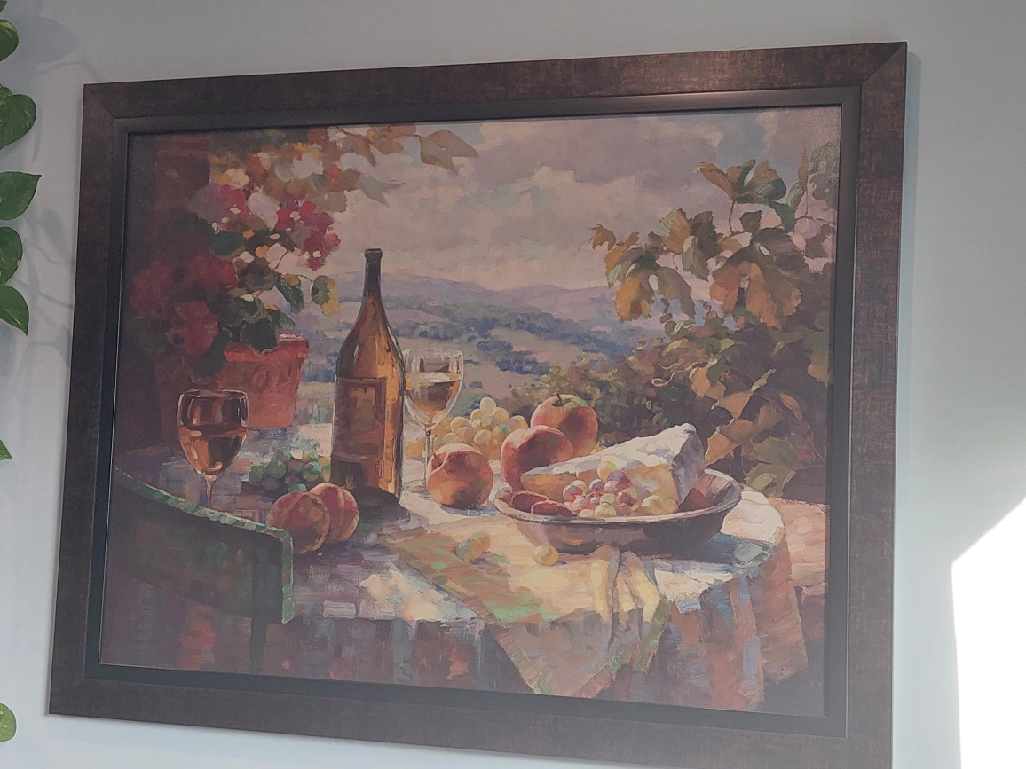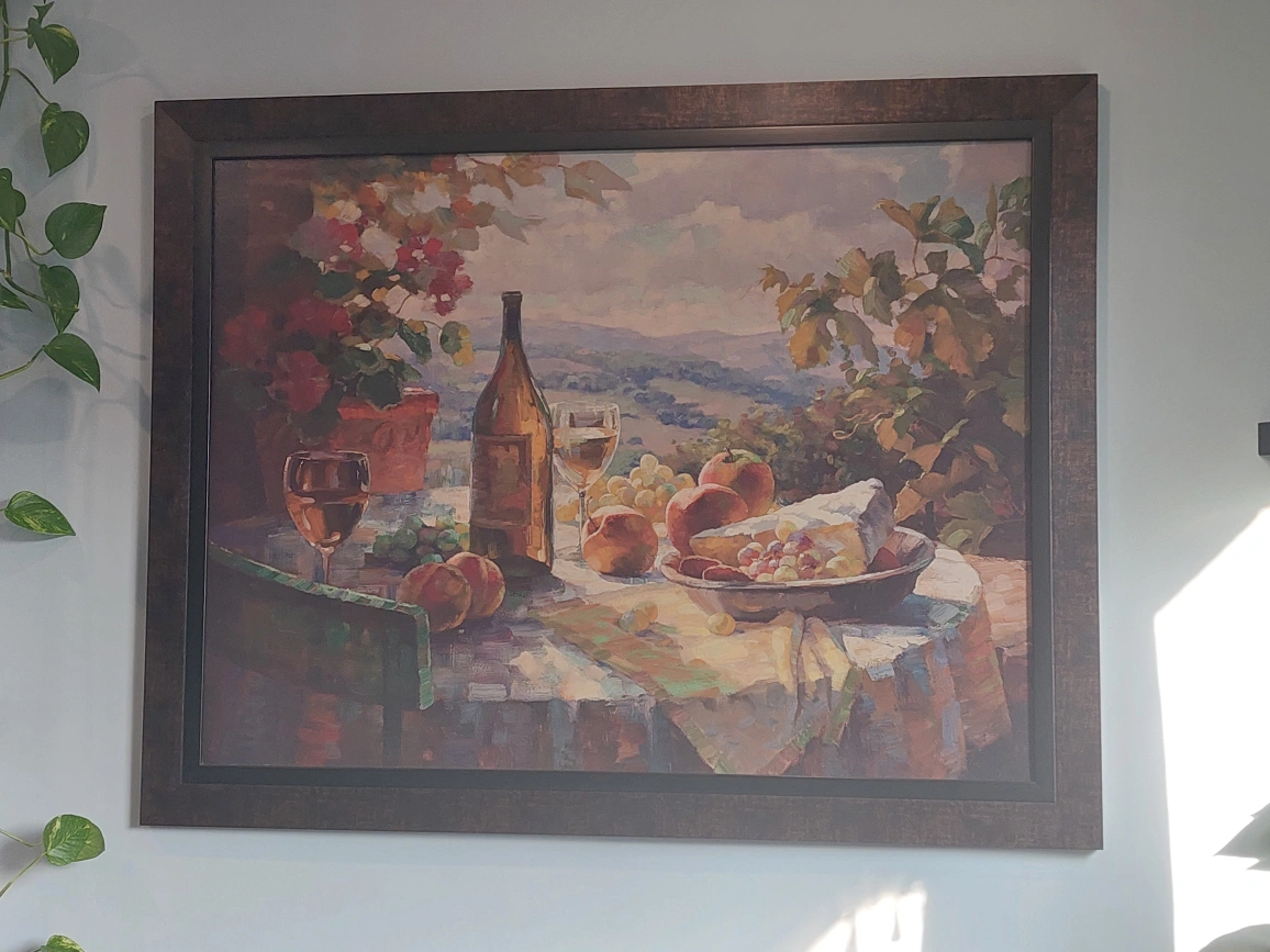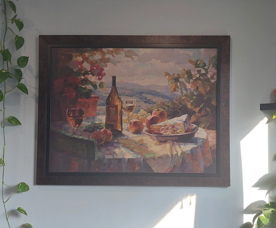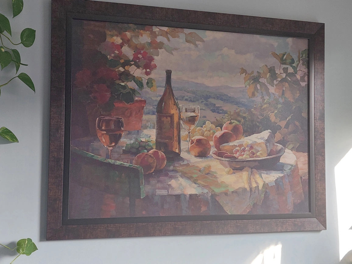 A lovely framed painting featuring a still life scene with wine, fruit, and flowers. It's in great shape and ready to brighten up any room in your home. The frame is a dark brown colour that complements the artwork nicely