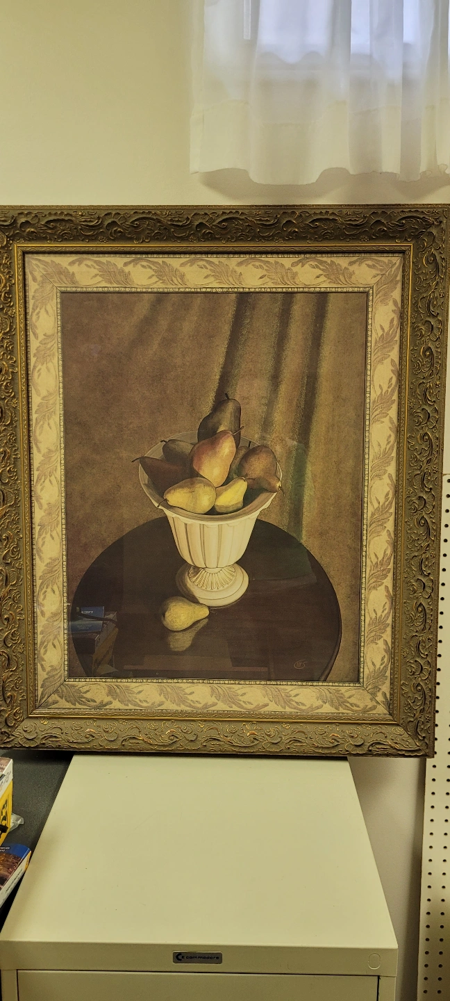 Ornate frame. Picture of pears in a bowl. Matted. Nice colours. Ready to hang. like new condition cash only