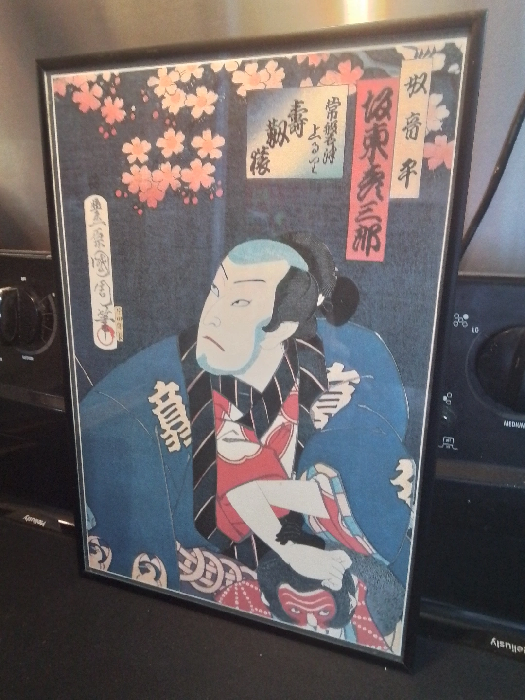 Framed Utagawa Kunisada Japanese Woodblock Print This is a framed Utagawa Kunisada Japanese woodblock print, showcasing a vibrant and dynamic scene typical of his Kabuki actor portraits and historical depictions. 11X16" H. Very good condition. Please See photos for more details. Condition: Minor wear. Here are some details: * **Artist:** Utagawa Kunisada * **Type:** Japanese Woodblock Print * **Theme:** Kabuki actors and historical scenes * **Frame:** Included This woodblock print exudes a sense of history, ready to bring an element of traditional Japanese art into your space. It's like owning a little piece of theatre history, without having to memorize any lines! If the ad is still up, yes, it's still available! Vintage framed print. Depicts a Kabuki actor. Features cherry blossoms. Black frame. Looks to be a reproduction of a Utagawa Kuniyoshi woodblock print. Pickup at Young Street and Steels Ave