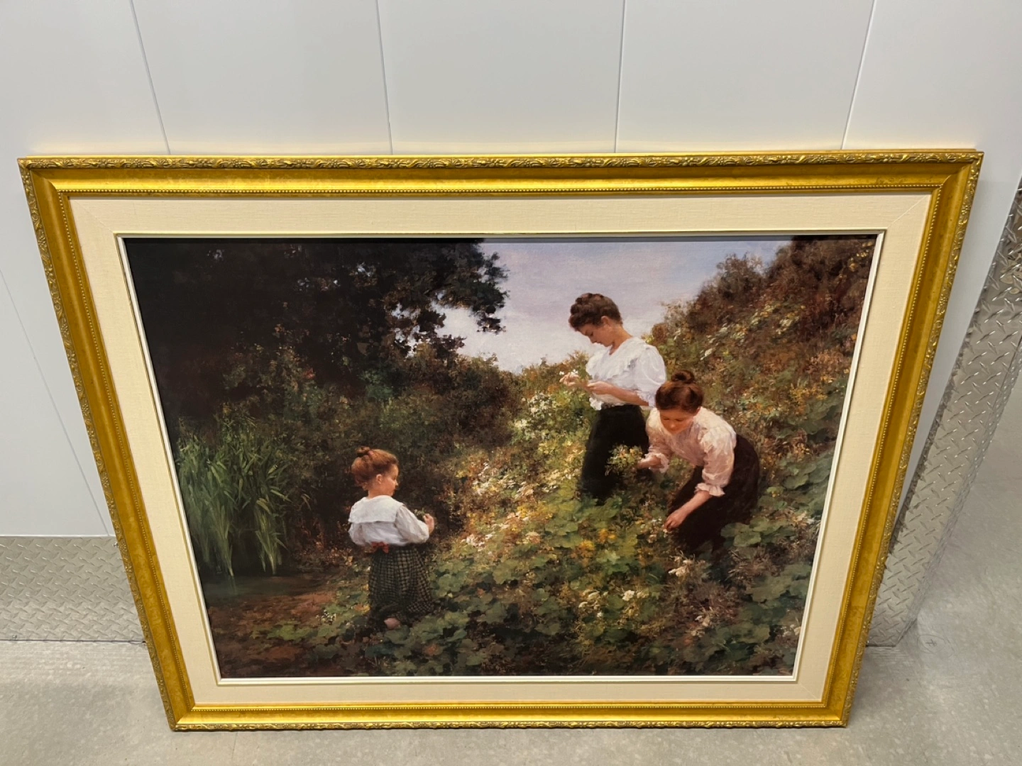 Large framed print, gold frame. Depicts three women and a child picking flowers. Nice colours. Suitable for home decor.
