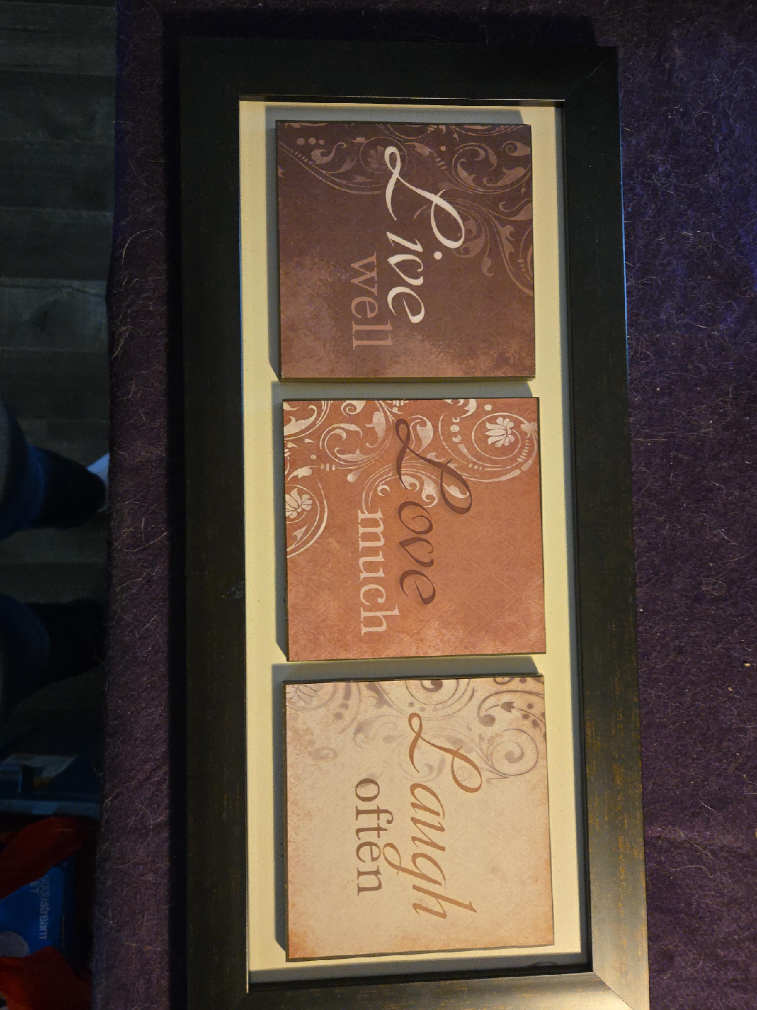 A charming piece of framed wall art featuring three panels with the words 'Live well', 'Love much', and 'Laugh often'. It's a lovely addition to any home decor!