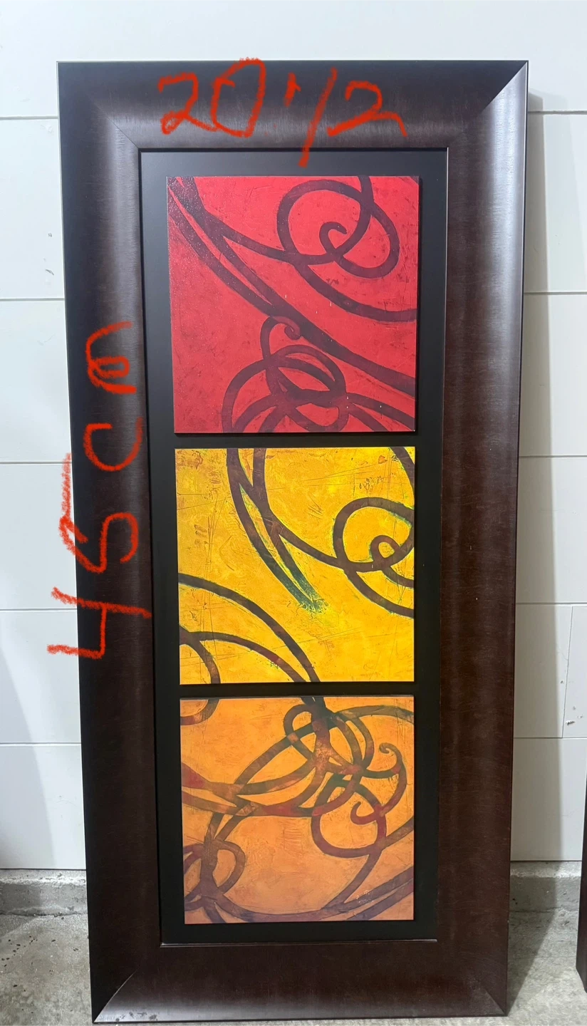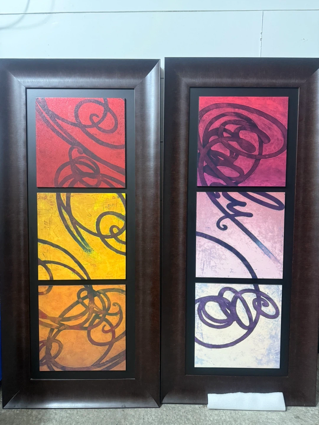 Selling a set of two framed wall art pieces. They feature a modern abstract design with a warm colour palette. Each frame measures approximately 45cm x 20cm