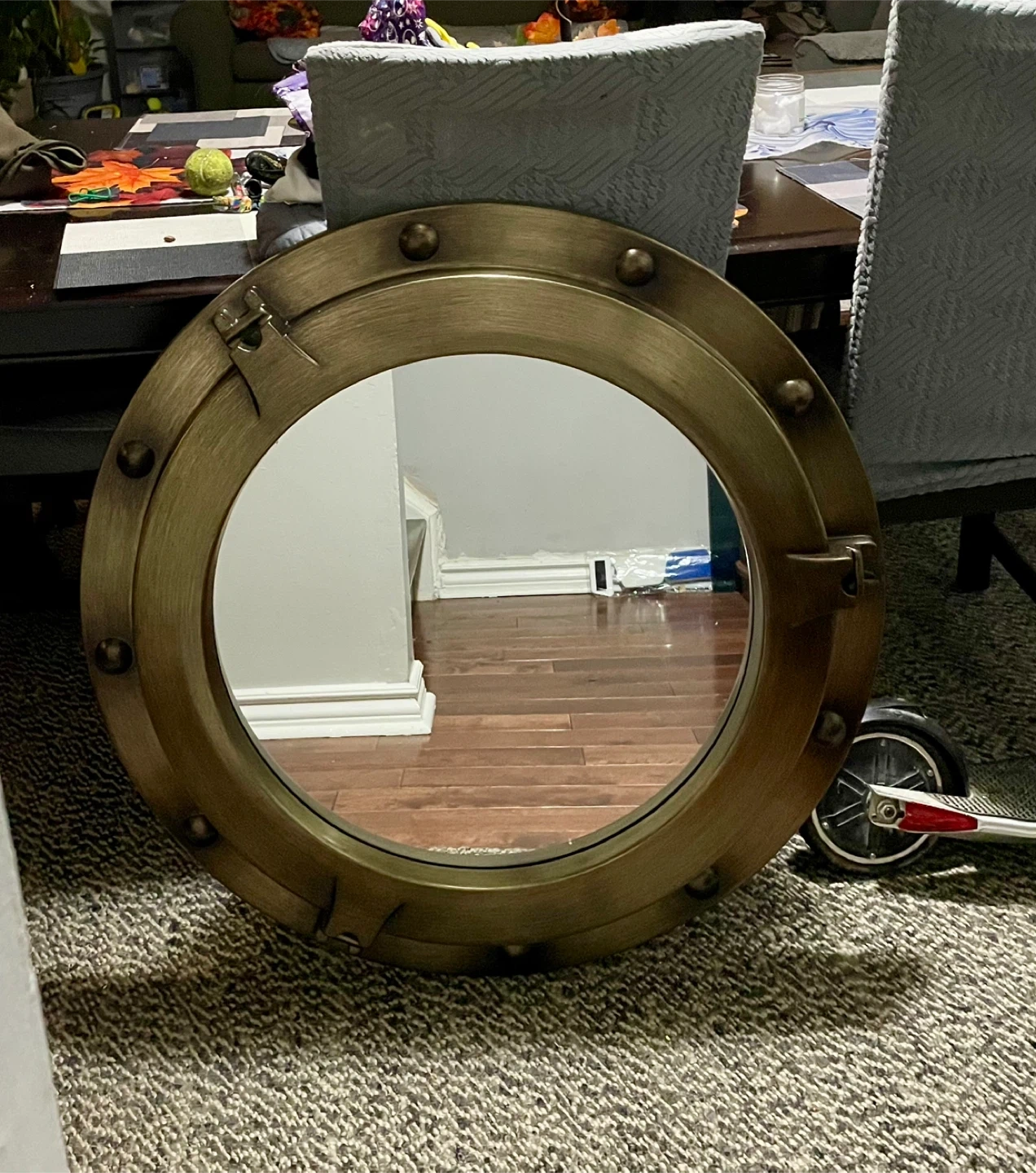 Selling a framed wall mirror in a unique porthole style! It's in great condition and ready to add a nautical touch to your home. The box is included for easy transport. New, opened to take photo only. Dimensions are 34/34 inches