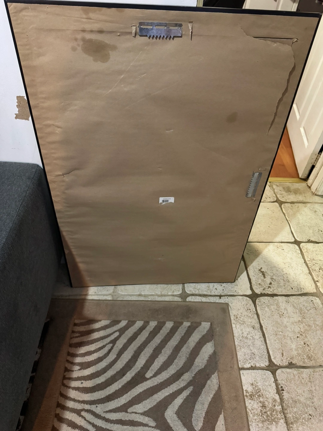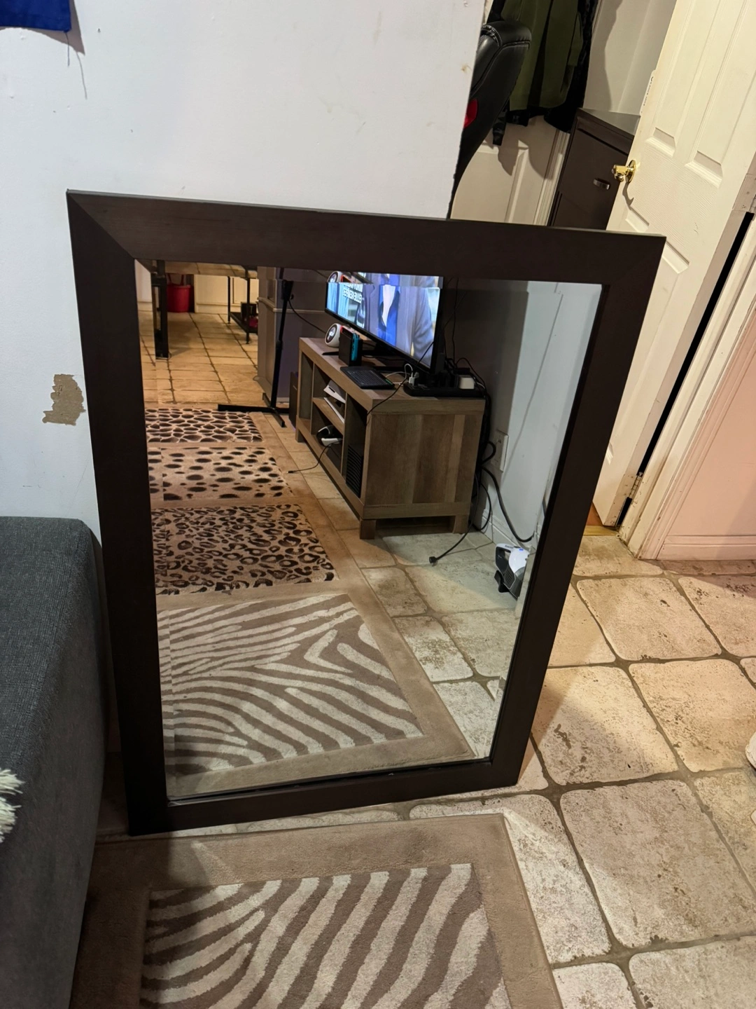 Selling a framed wall mirror. It's in good condition and ready to hang in your home. The frame is a dark colour. Perfect for adding some style to any room Dimensions: Length 40inches Width 28.5 inches