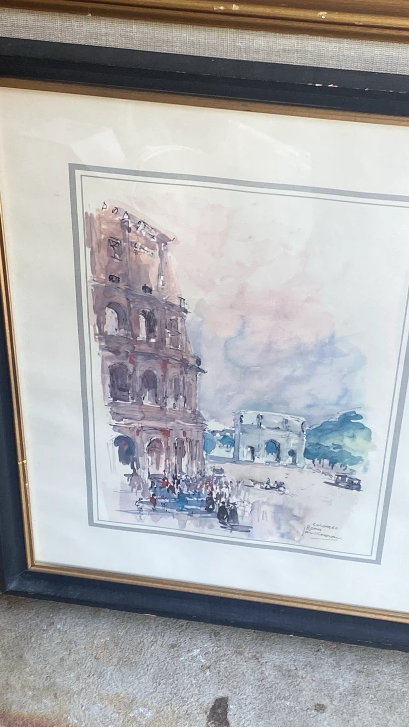Selling a framed watercolor painting depicting the Colosseum in Roma. The frame is black with a gold trim. It's a lovely piece!