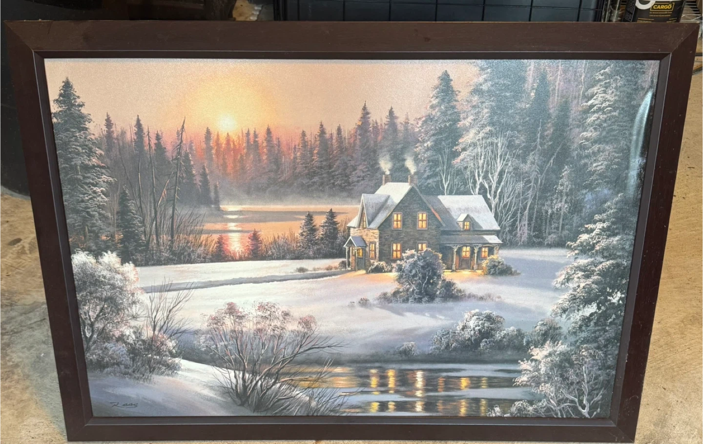 A beautiful framed painting depicting a serene winter landscape with a house nestled among snow-covered trees and a reflective lake. The scene captures a peaceful sunset or sunrise, adding warmth to the snowy setting. The frame is a dark brown colour.
