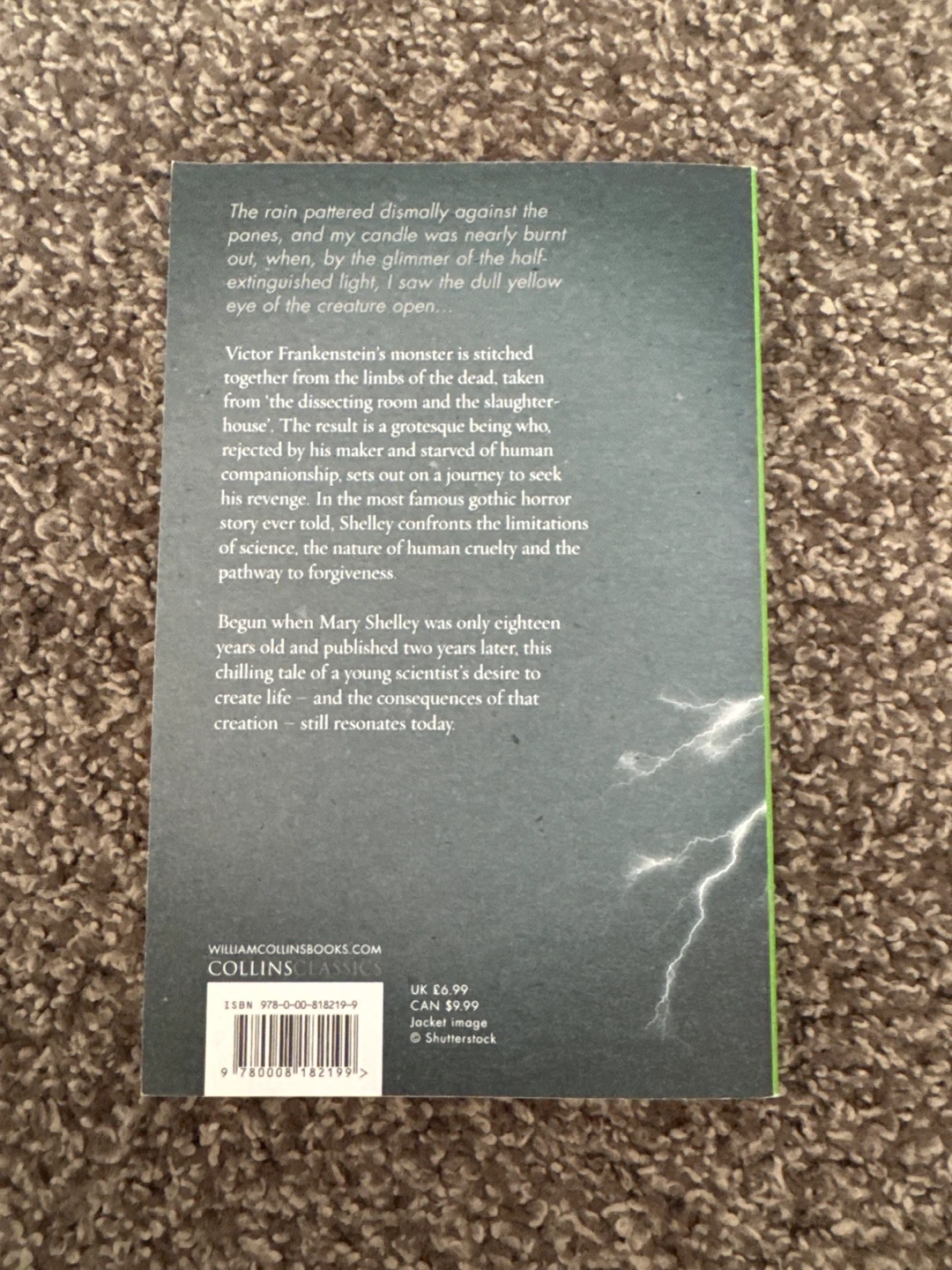 Selling a copy of Frankenstein by Mary Shelley, published by Collins Classics! It's a great read and a beautiful edition to have on your bookshelf. The book explores themes of science, nature, and humanity's capacity for cruelty and forgiveness