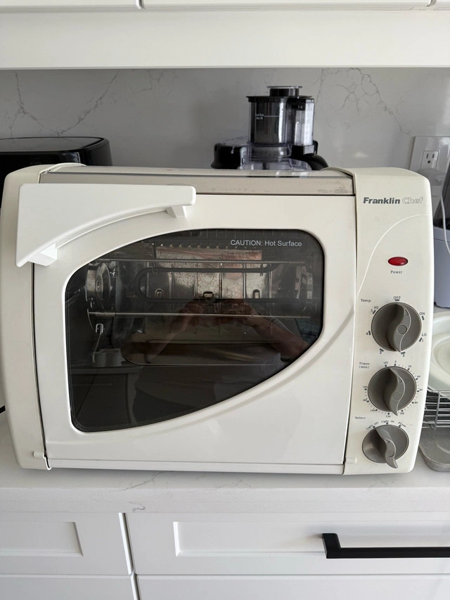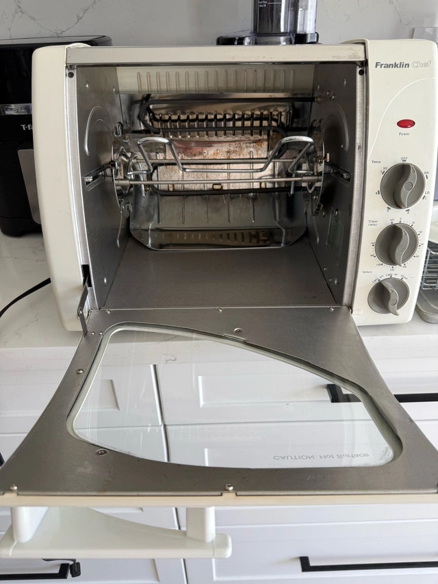 GUC Franklin Chef Horizontal Rotisserie oven with accessories. Key Features: * Rotisserie function for evenly cooked poultry and meats. * Multiple cooking settings including bake, broil, and toast. * Adjustable temperature control for various recipes. * Built-in timer for precise cooking.