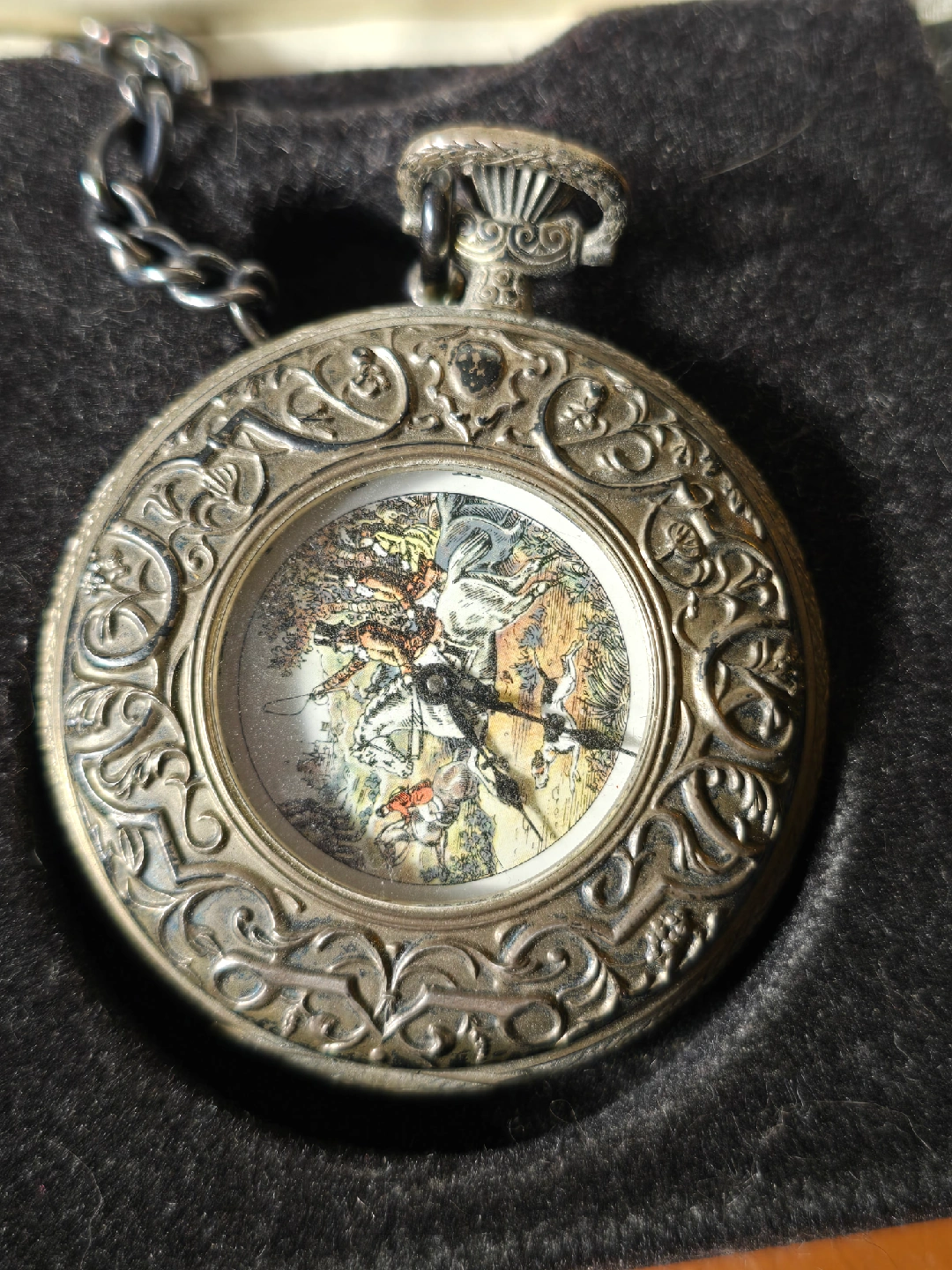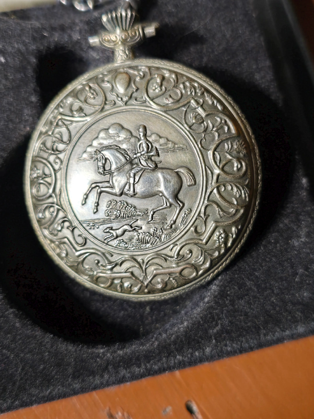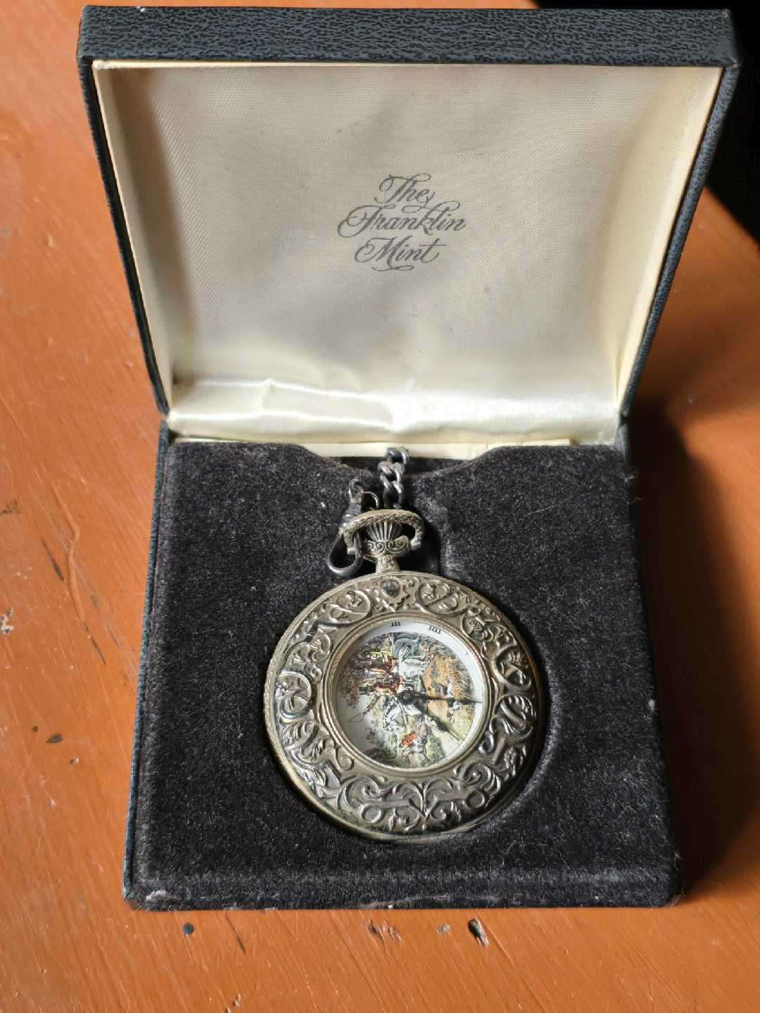 Selling a beautiful Franklin Mint pocket watch! It comes in its original box, perfect for collectors or as a unique gift. The watch features a detailed design with a horse and rider scene. It's a lovely piece to add to any collection!