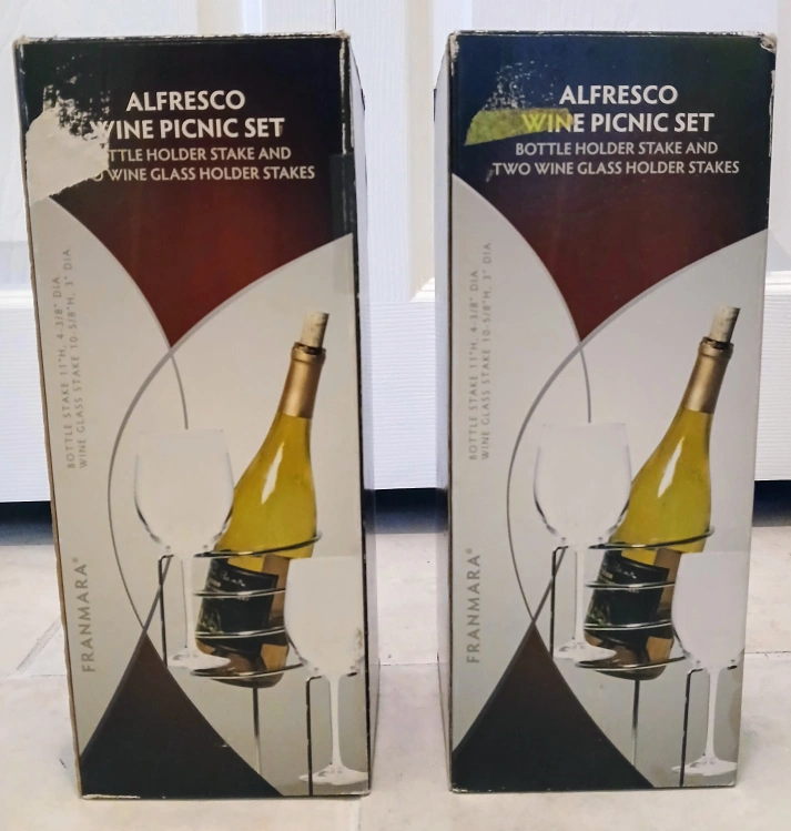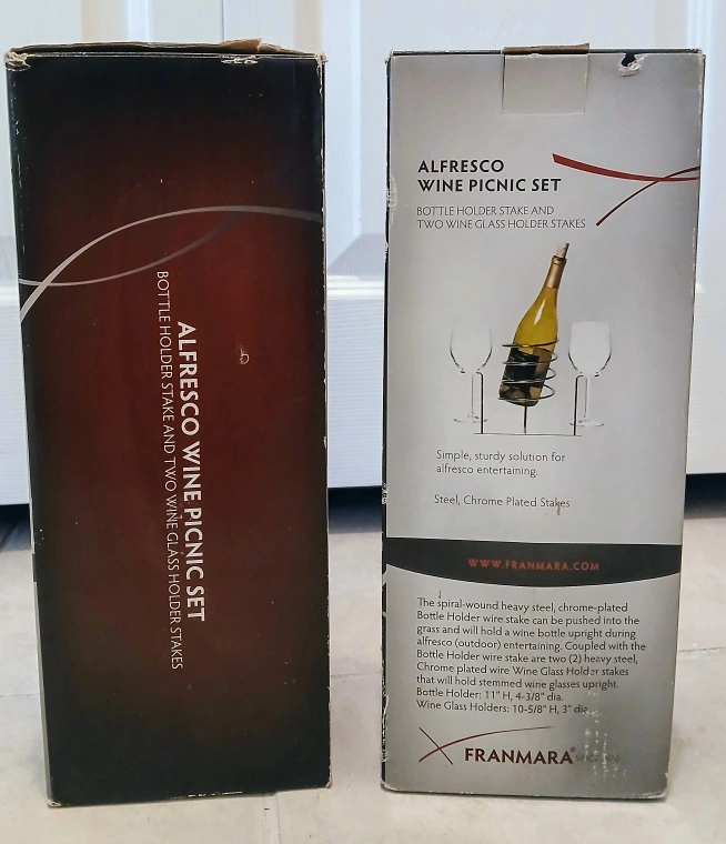 Franmara Alfresco Wine Picnic Set, comes with a bottle holder stake and two wine glass holder stakes - Bottle stake: 11"H, 4-3/8" dia - Wine glass stake: 10-5/8"H, 3" dia Simple, sturdy solution for alfresco entertaining Steel, Chrome Plated Stakes
