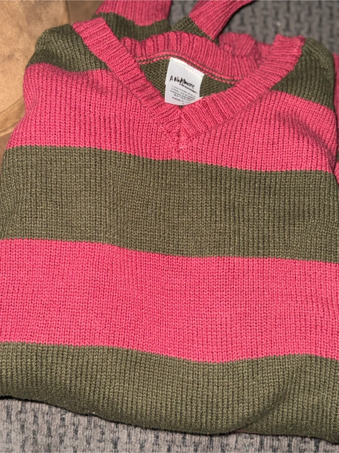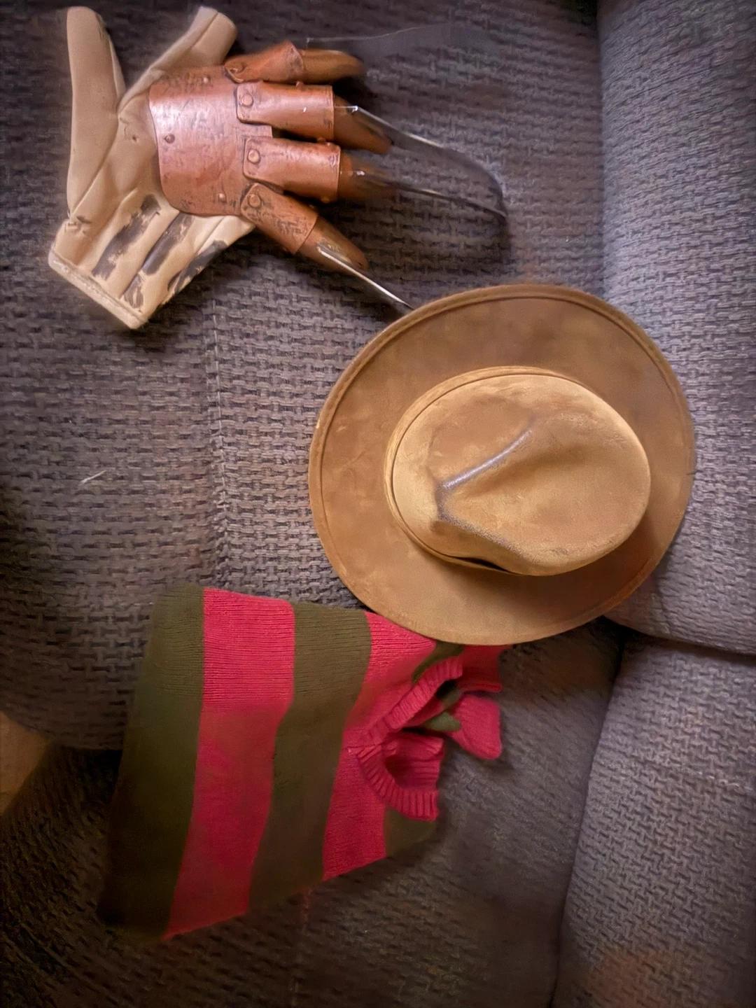Selling a Freddy Krueger costume set from A Nightmare on Elm Street! Includes the iconic striped sweater (size L), the glove with the metal claws, and the fedora hat. Perfect for Halloween or any horror movie fan!