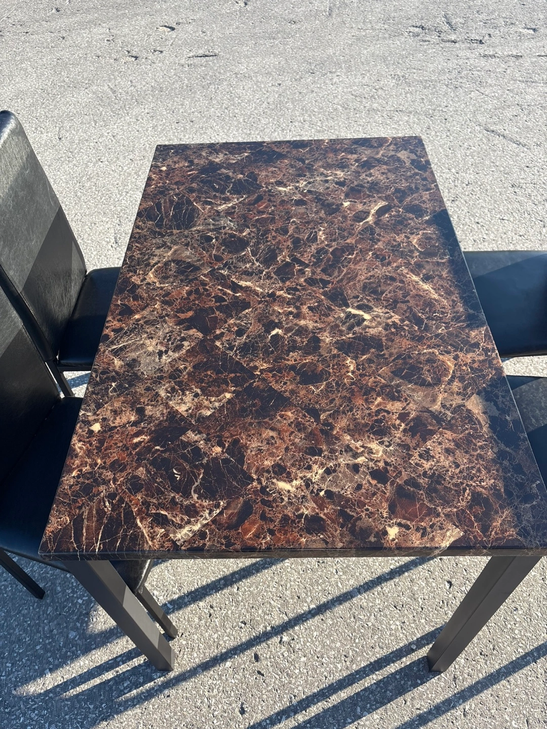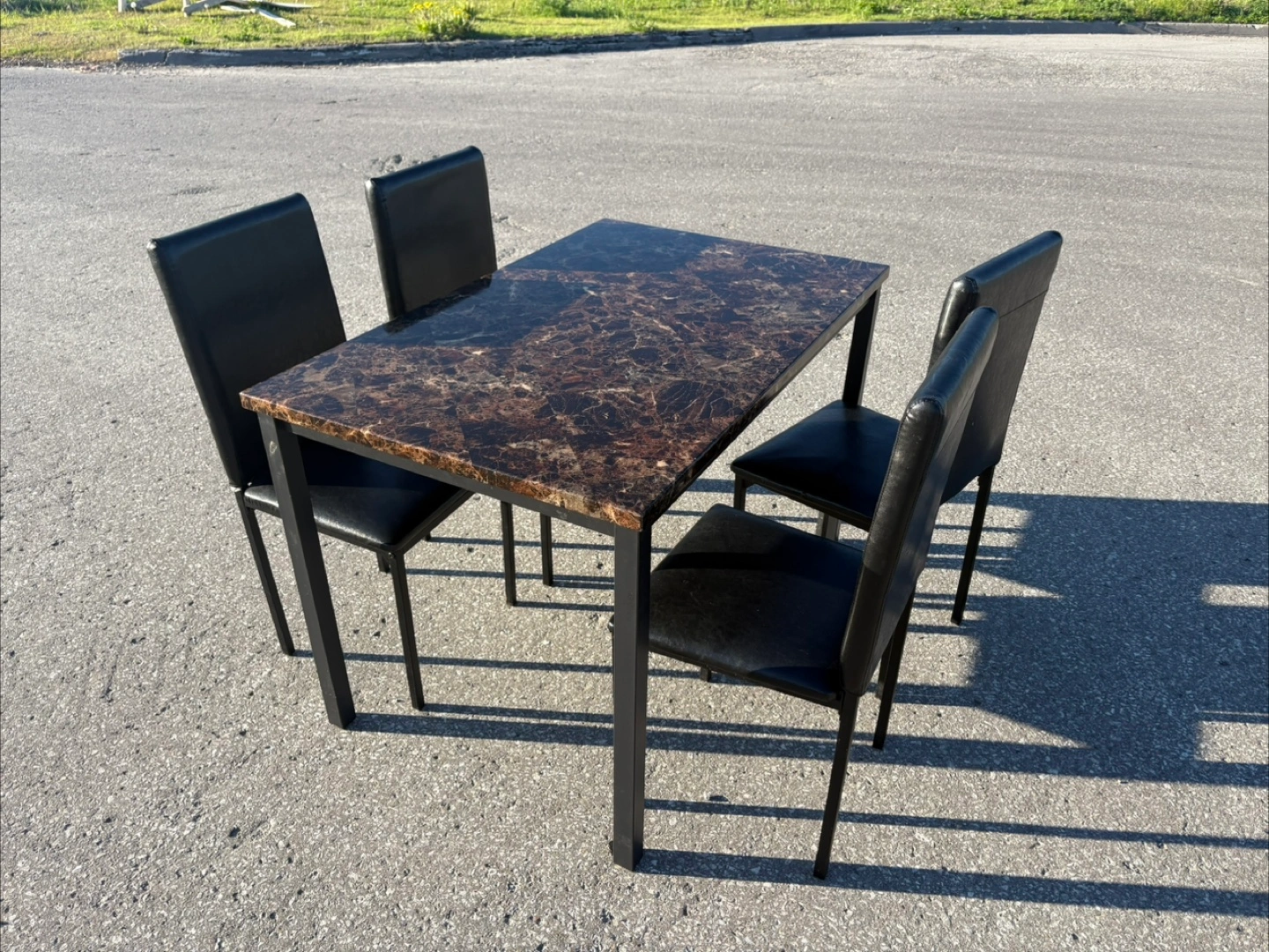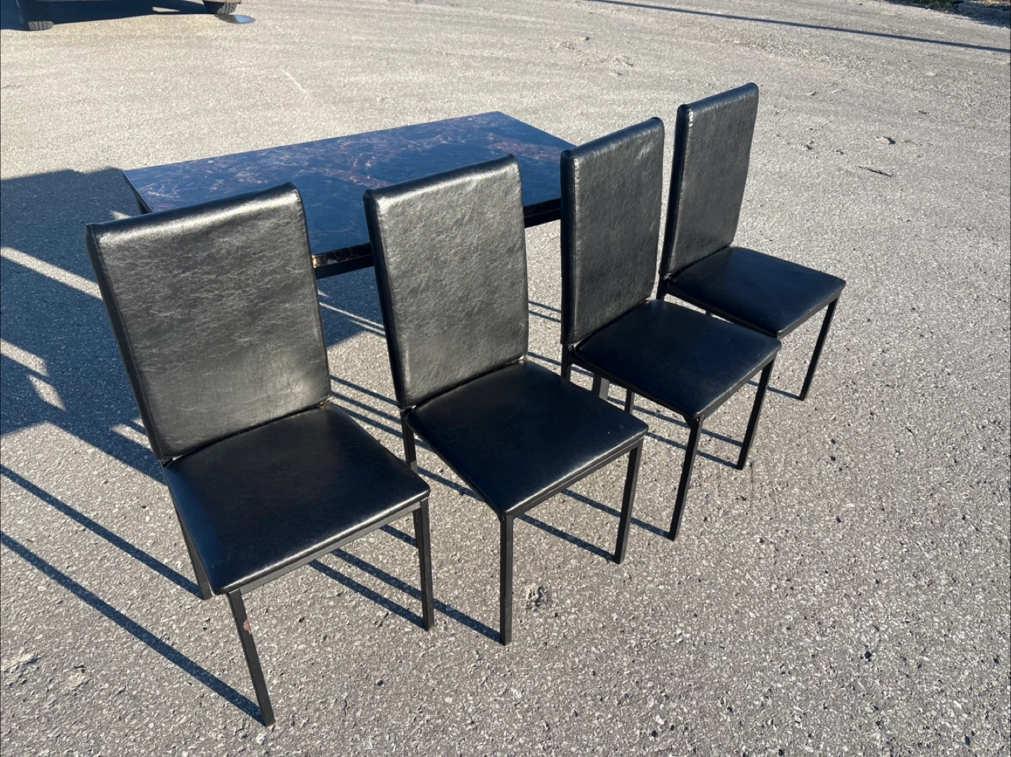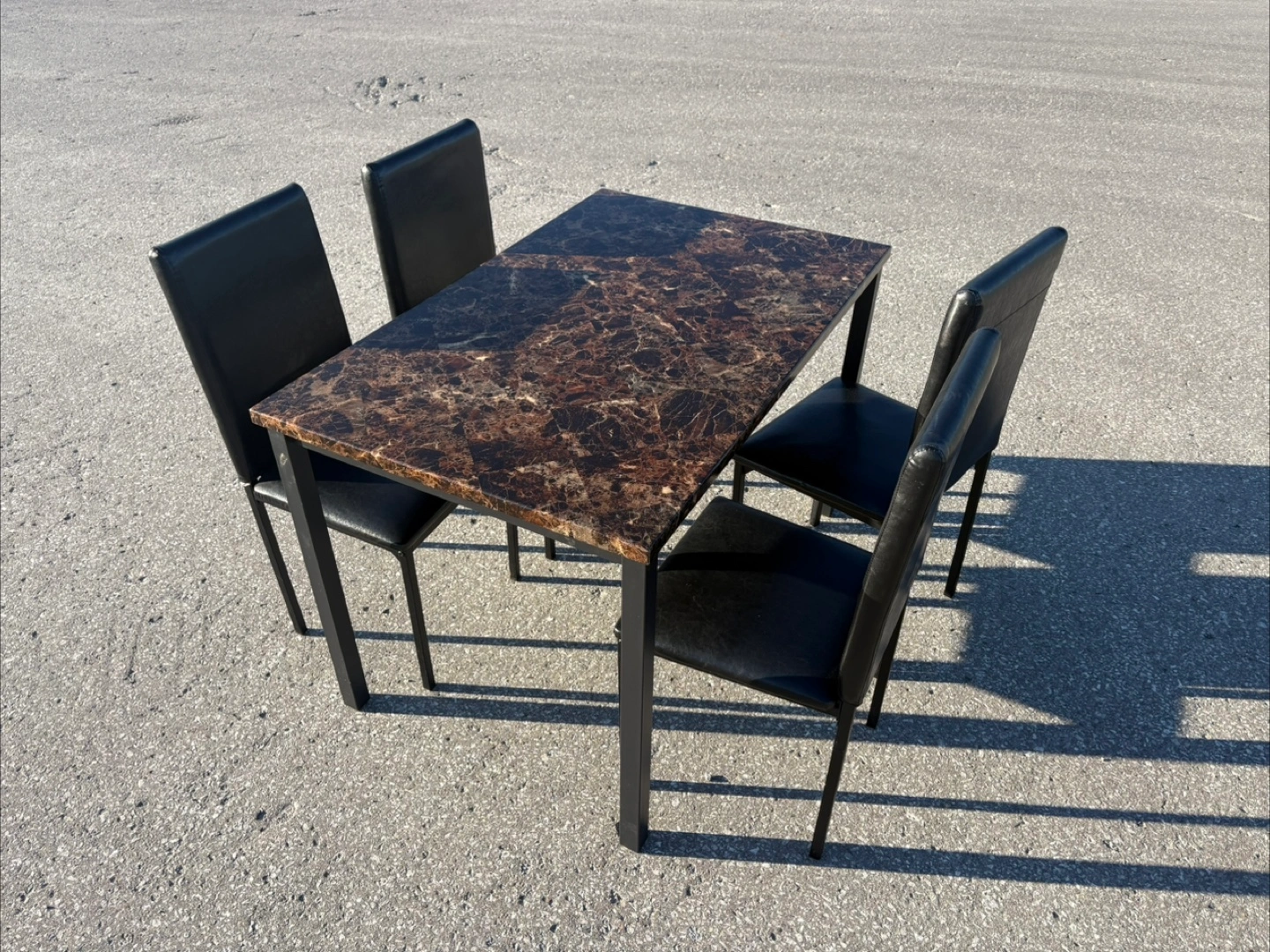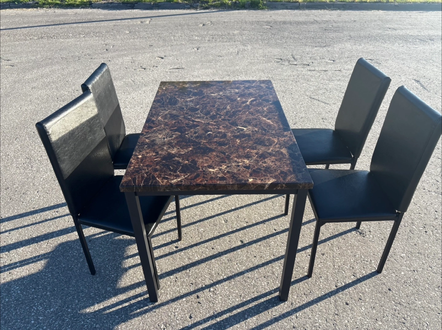 ✅ SAME DAY FREE DELIVERY AVAILABLE🚚💨 $170 🏷️ OBO ITEM DESCRIPTION: - modern dining table + 4 chairs - wood - 4 dark brown / black leather chairs - nice modern look - Colour: as shown in image / brown - minor scratches/nicks - no major marks/stains MEASUREMENTS 📏: L: 48” x W: 30” x H:30” (approx) ✅SAME DAY FREE DELIVERY AVAILABLE🚚💨 ✨ALL ITEMS FIRST COME FIRST SERVE ✨