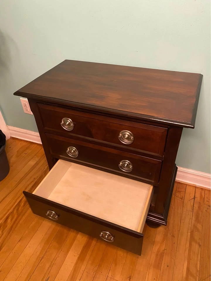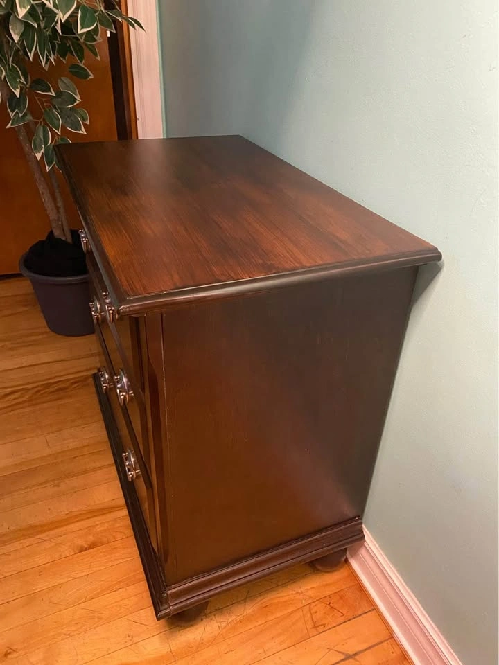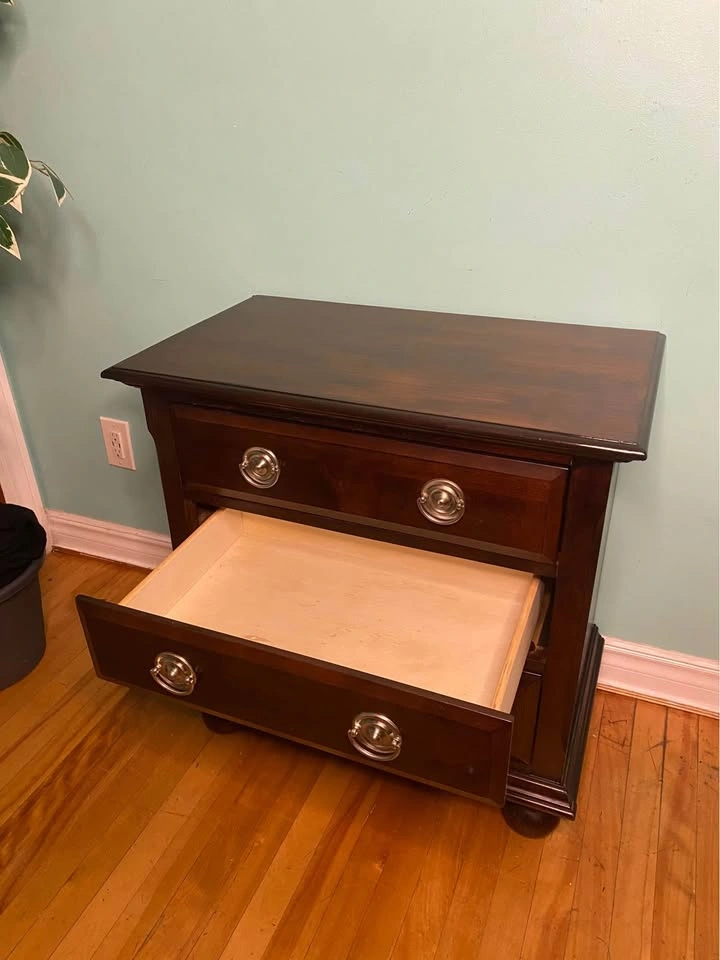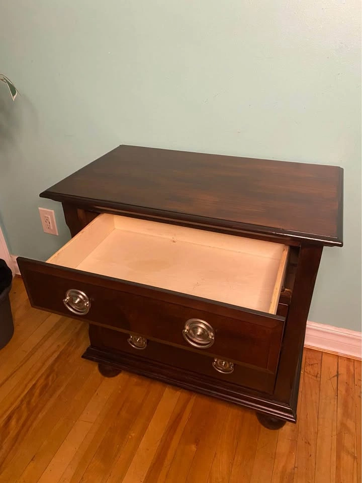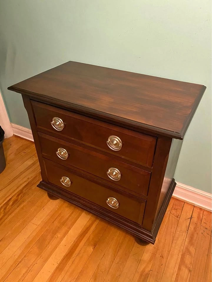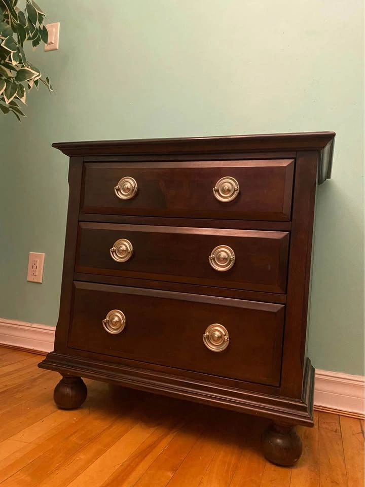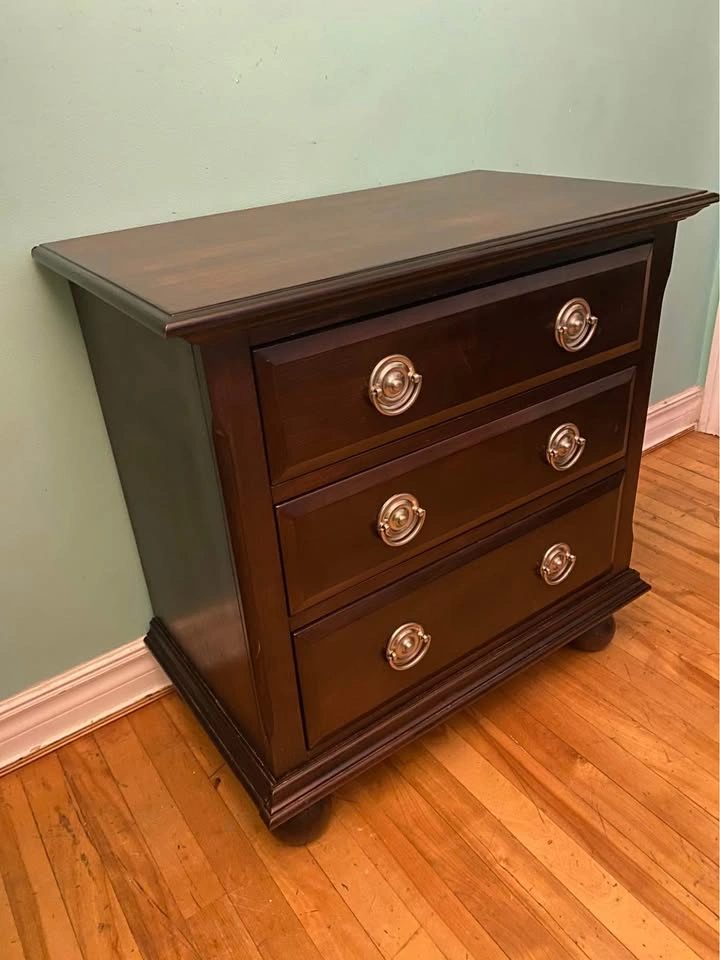 Beautiful end/side/night table. Dark espresso on real maple hardwood. Modern styling. The top was refinished with a brand new stain. A glossy seal protects the top where the most contact is expected, against the likes of scuffs and liquids. All the drawers work perfectly and everything is clean. 3 spacious drawers. Smoke-free / pet-free household, with no discernible odours. Delivery is included in the price, available throughout HRM. Right to refuse is in place, please inspect on delivery. $120 Exact Measurements: Height: 29.5 inches (or 2 FT & 5.5 inches). Width: 29.25 inches (or 2 FT & 5.25 inches). Depth: 17 inches (or 1 FT & 5 inches).