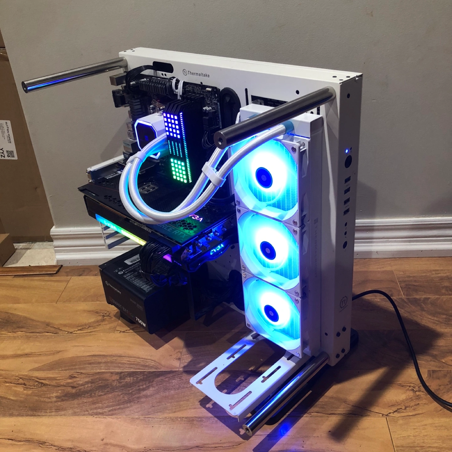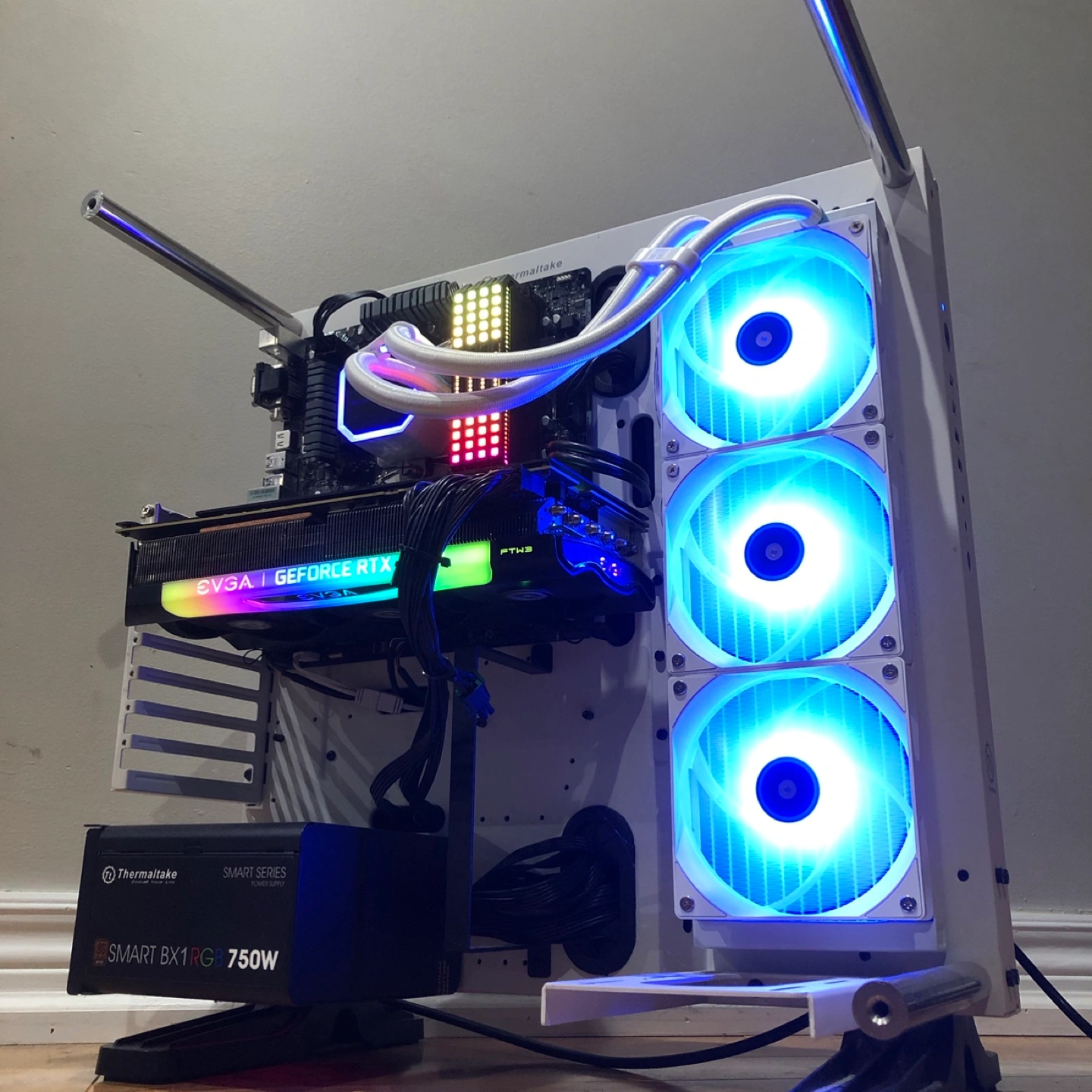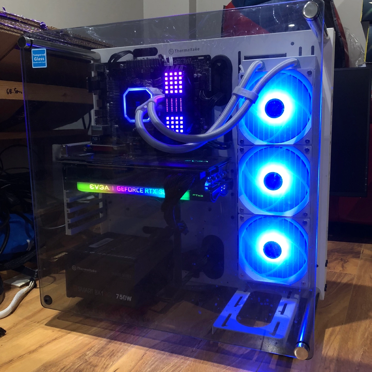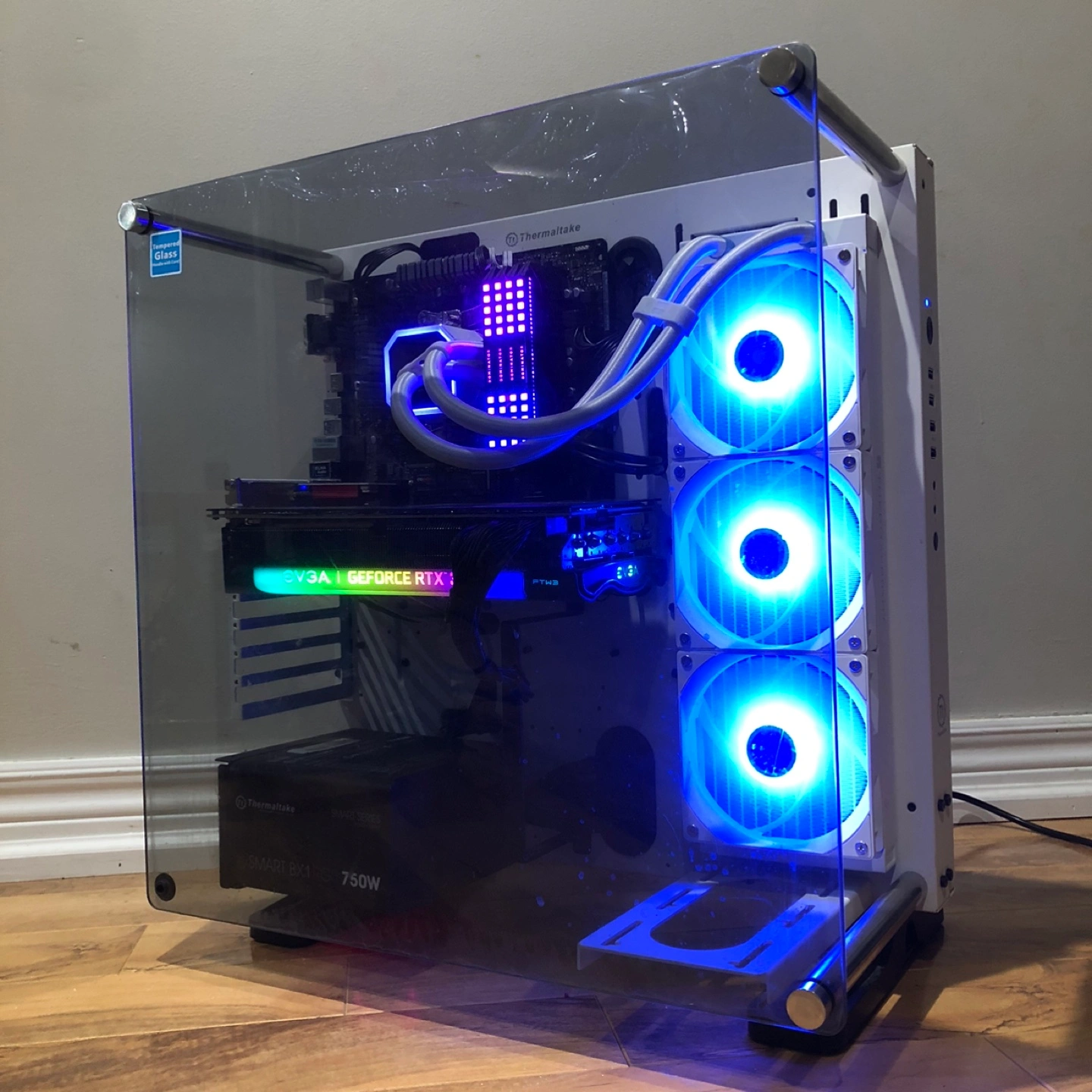 Selling a custom-built gaming PC in a Thermaltake case! It features an EVGA GeForce RTX 3080 graphics card for amazing performance. The case has a tempered glass side panel to show off the components and RGB fans. It also comes with a Thermaltake Smart BX1 750W power supply.
