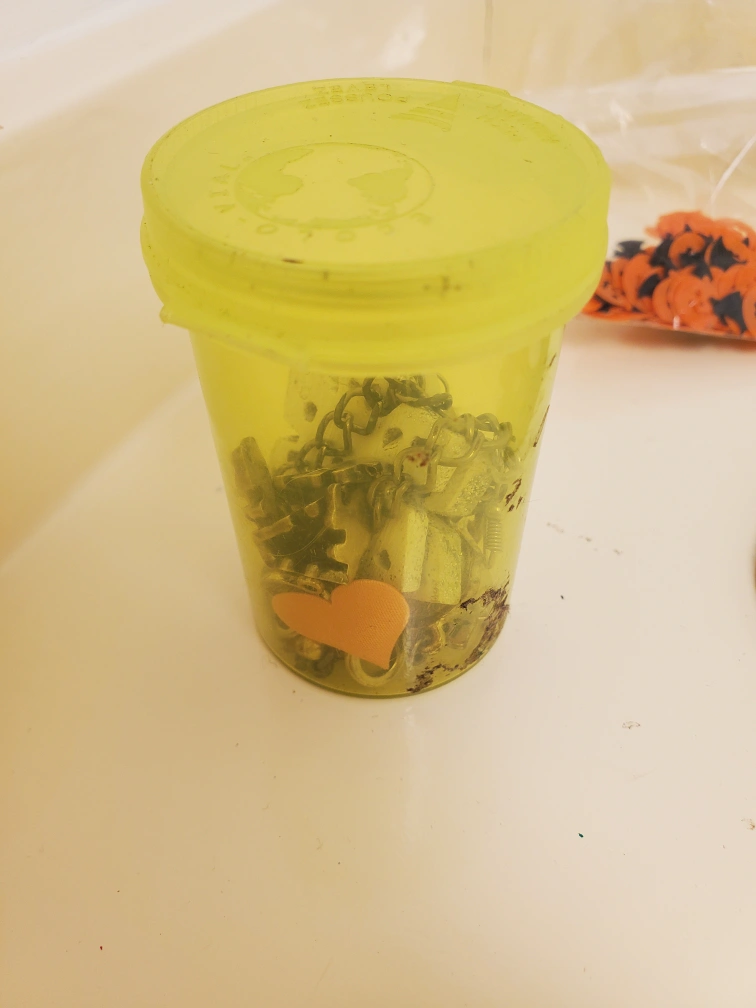 Giving away a collection of Halloween and craft supplies! Includes a container of various charms, a bag of pumpkin and bat confetti, and a metal bear claw pendant