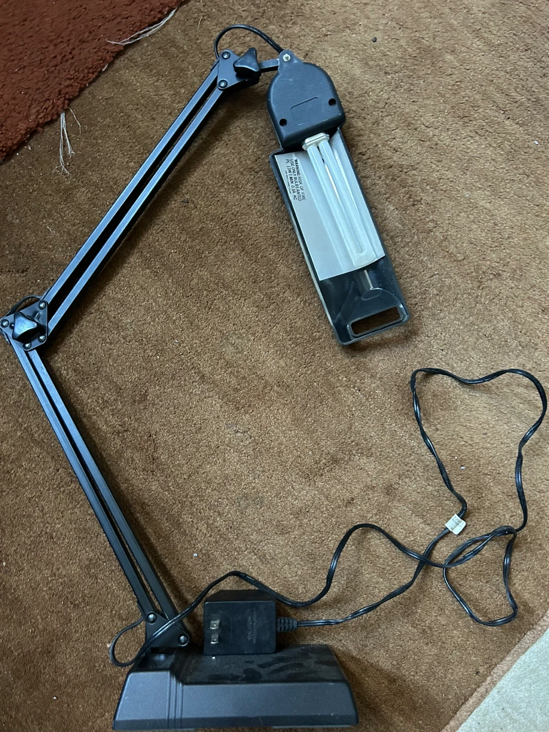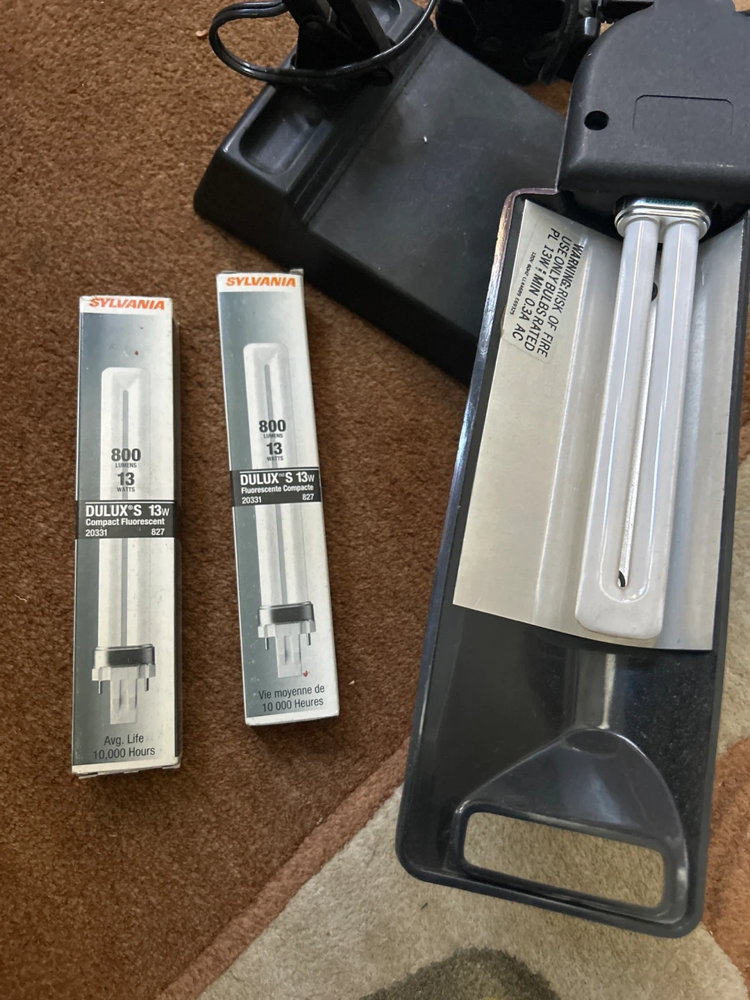 Selling a basic adjustable black desk lamp. It comes with two extra Sylvania Dulux S 13W bulbs. The bulbs are 800 lumens and have an average life of 10,000 hours. Great for a desk or workspace!
