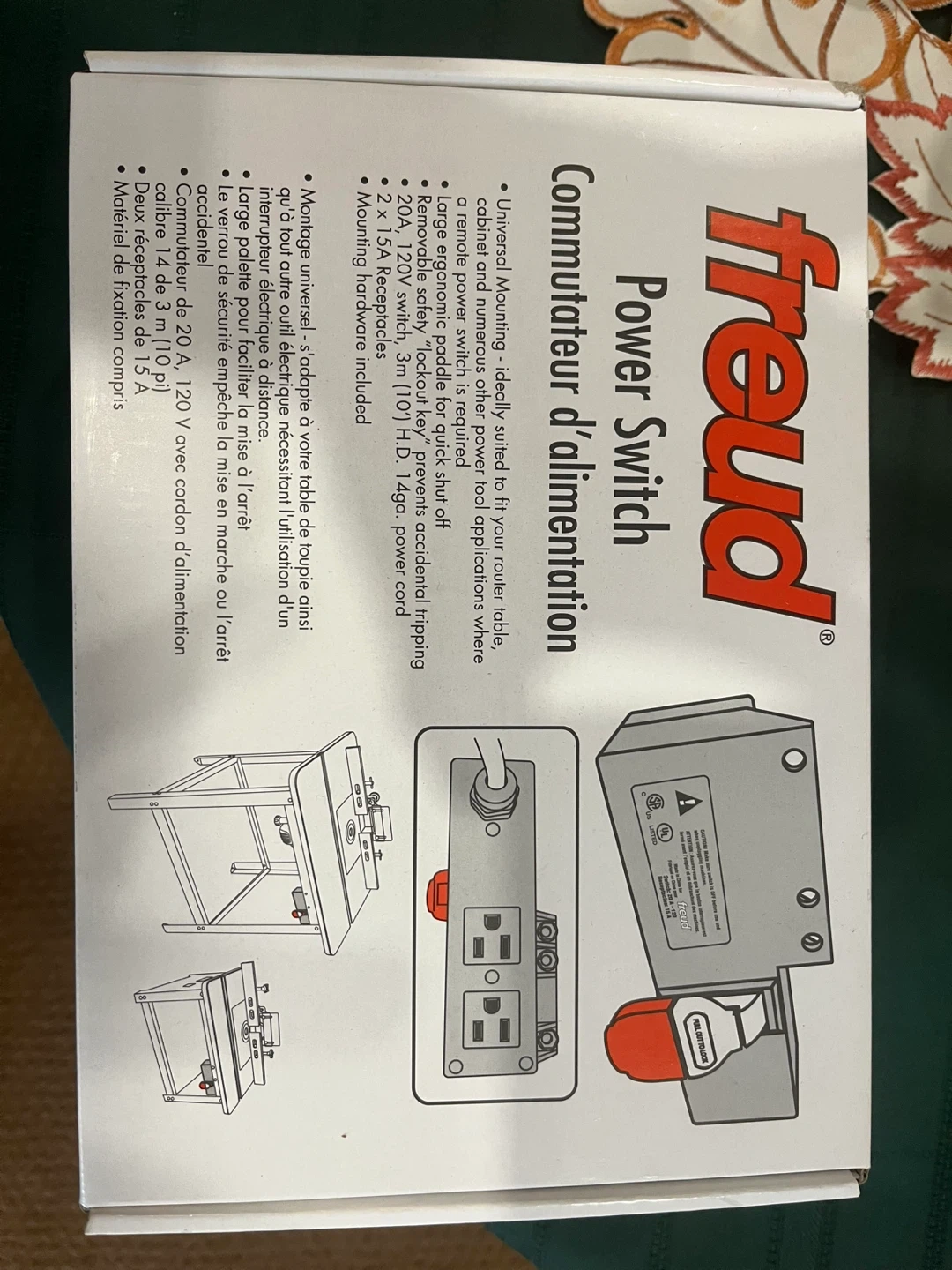 Selling a Freud Power Switch, also known as Commutateur d'alimentation. It's ideally suited to fit your router table, cabinet, and numerous other power tool applications where a remote power switch is required. - Large ergonomic paddle for quick shut off - Removable safety "lockout key" prevents accidental tripping - 20A, 120V switch, 3m (10') H.D. 14ga power cord - 2 x 15A Receptacles - Mounting hardware included