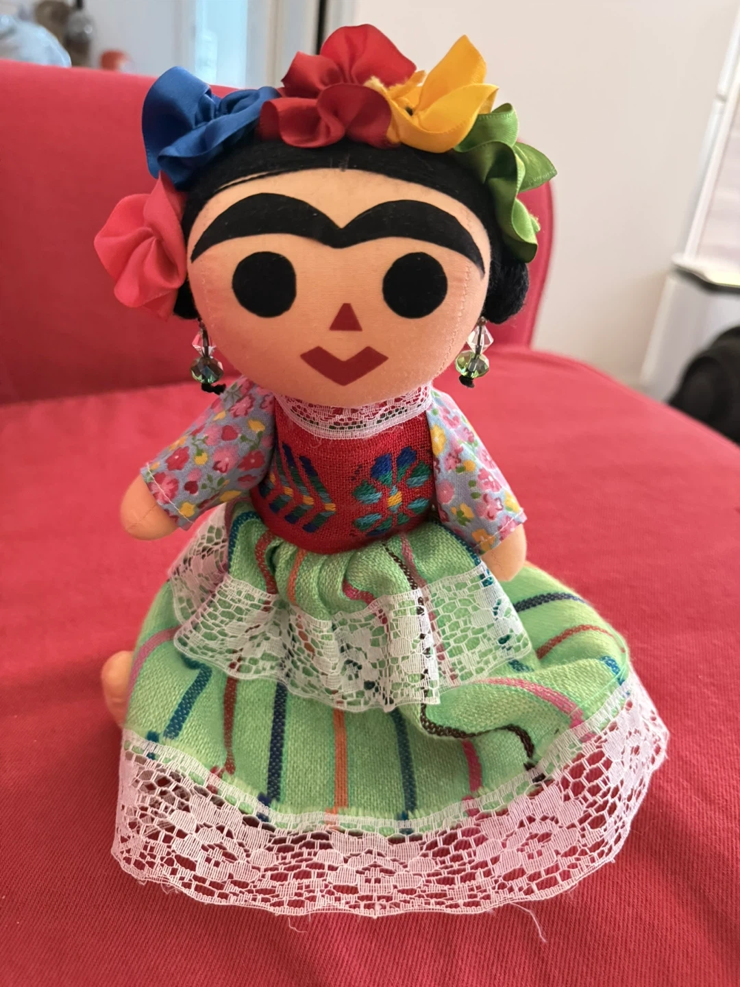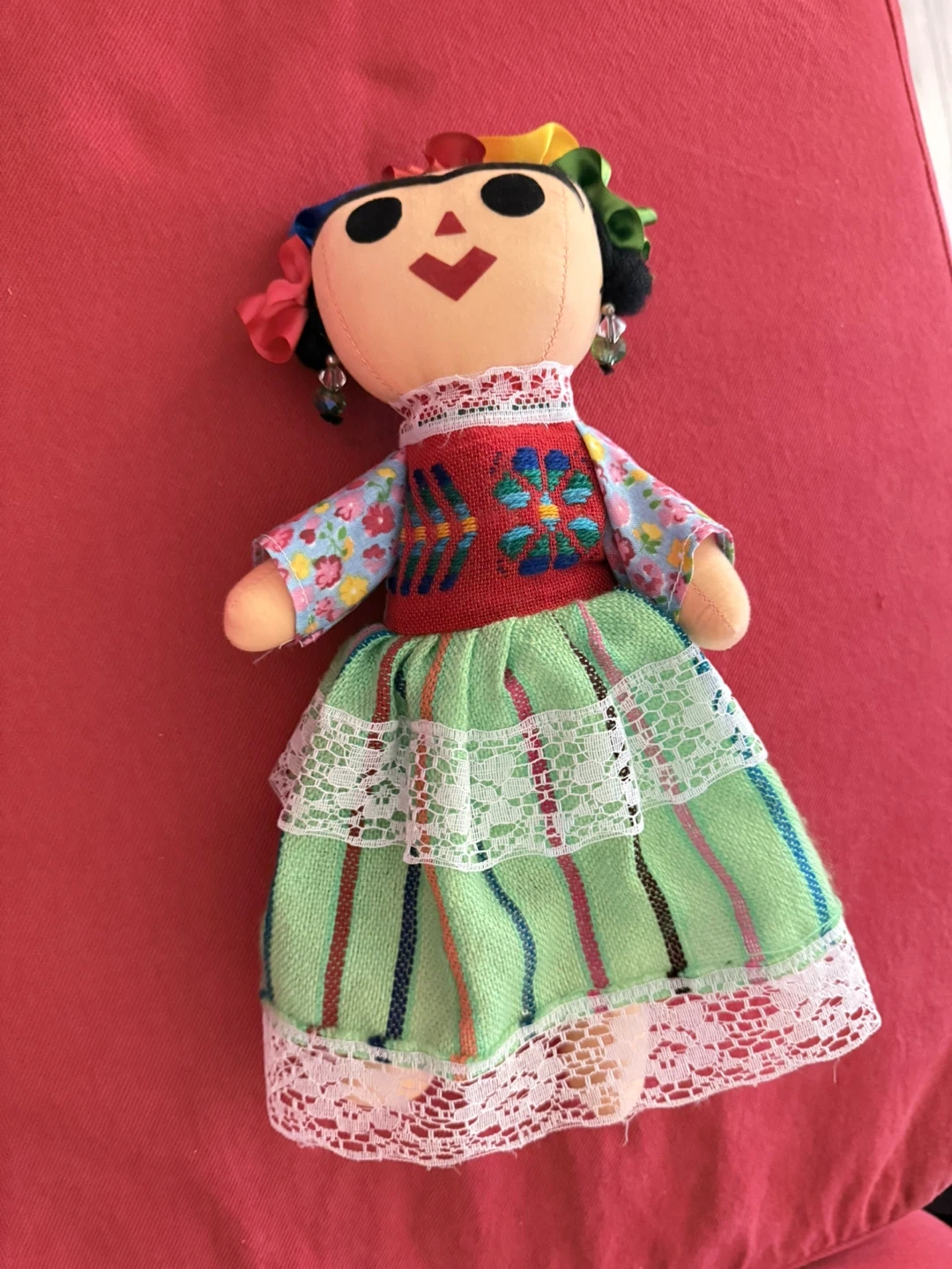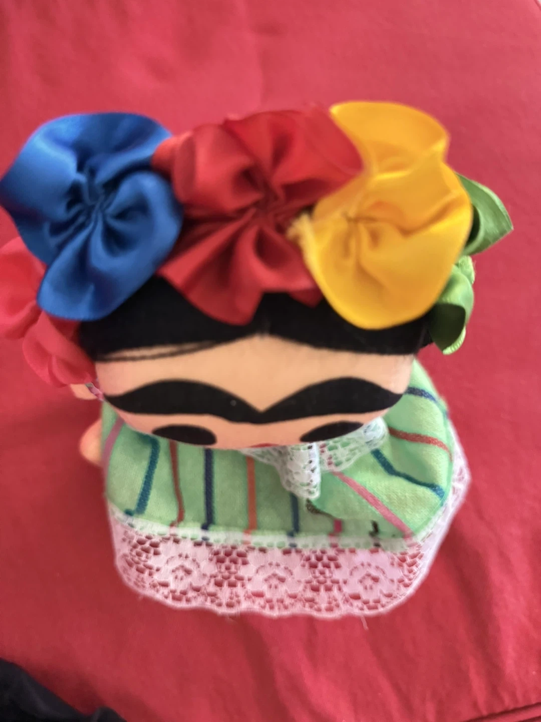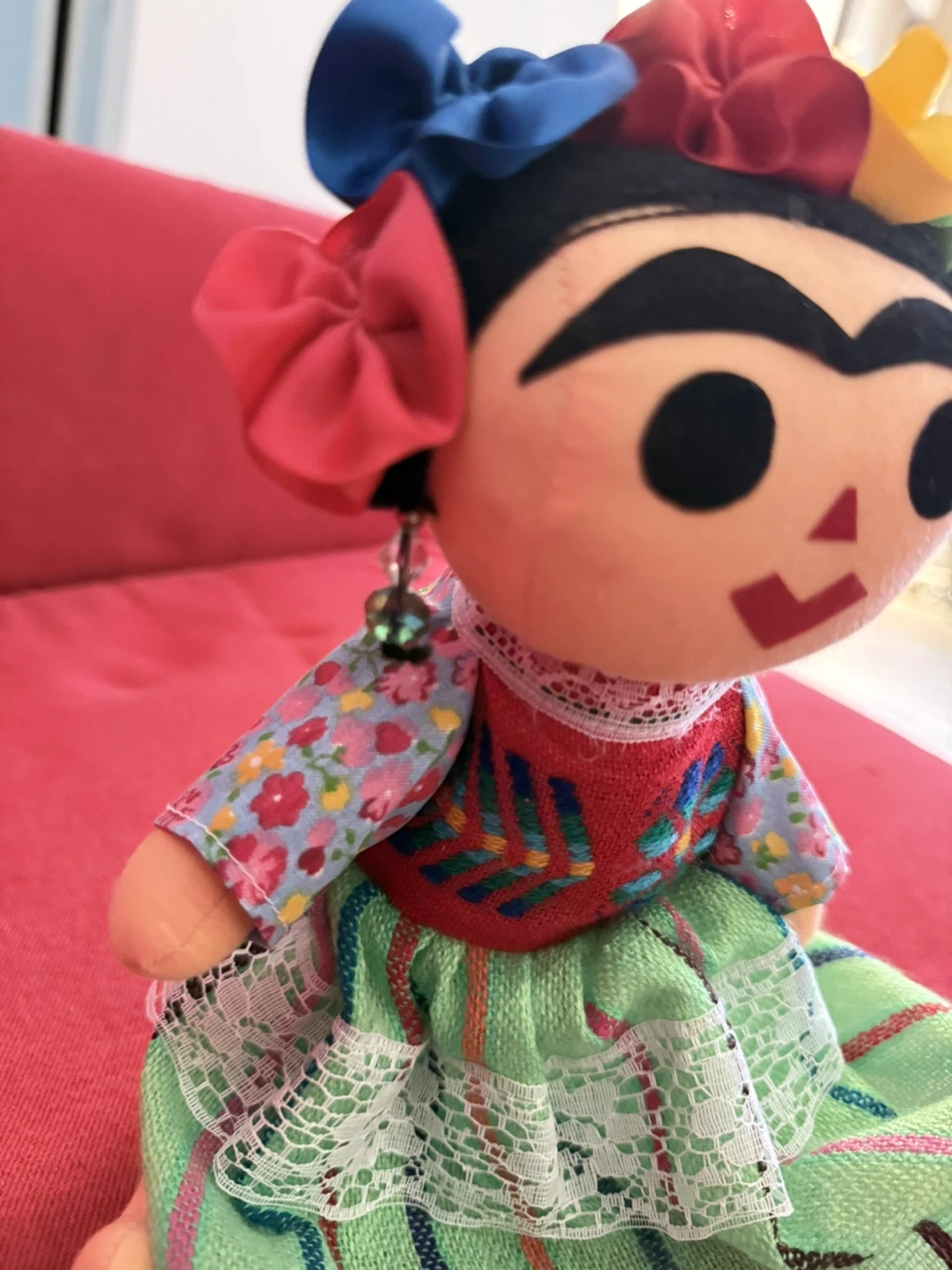 A cute Mexican traditional Frida Kahlo inspired plush doll! She's wearing a colourful outfit with a green skirt and red top, complete with floral details and ribbons in her hair. A charming addition to any collection or a sweet gift!