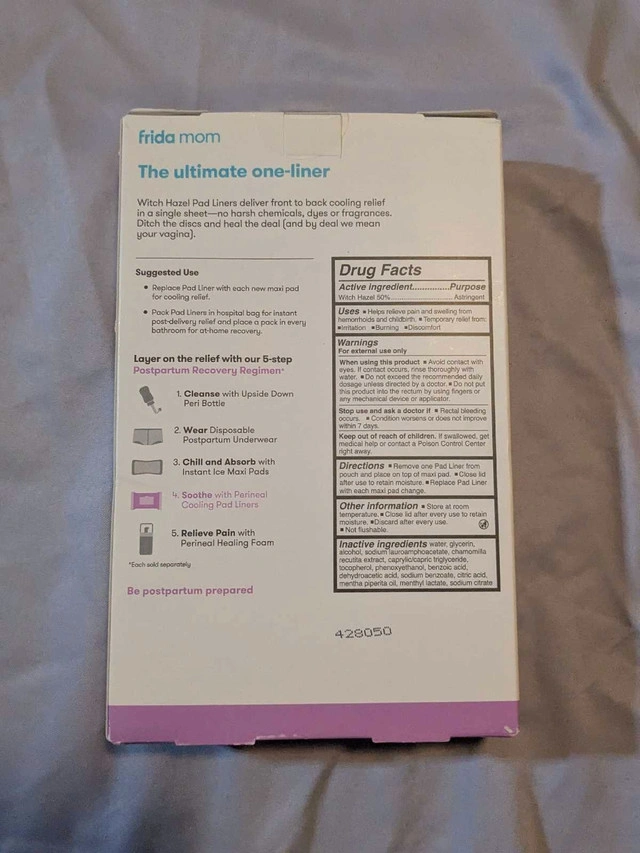 Retail $20 asking $10 OBO. New, never opened. Smoke-Free pet-free home. Frida Mom Witch Hazel Perineal Cooling Pad Liners for Postpartum Care, Hospital Bag Essentials for Pain Relief After Birth, Full-Length Medicated Cooling Pad Liners (24ct) COOLING RELIEF: Witch Hazel cooling pads provide cooling relief during postpartum recovery. Store pack in refrigerator for added cooling. FULL COVERAGE: Length of liner covers most maternity pads to help reduce swelling and speed up healing in the full perineal area. A bathroom essential during your postpartum recovery NO HARSH CHEMICALS : Made with medicated witch hazel - no dyes or fragrances. POSTPARTUM CARE: Add to your hospital bag essentials and use during your first postpartum bathroom trip at the hospital and at each bathroom trip once home. Cash and cashless payment accepted.