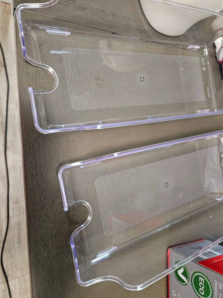 Selling two clear plastic fridge door bins! They're in great shape and ready to help organize your fridge. Perfect for keeping your condiments, drinks, or snacks neatly stored